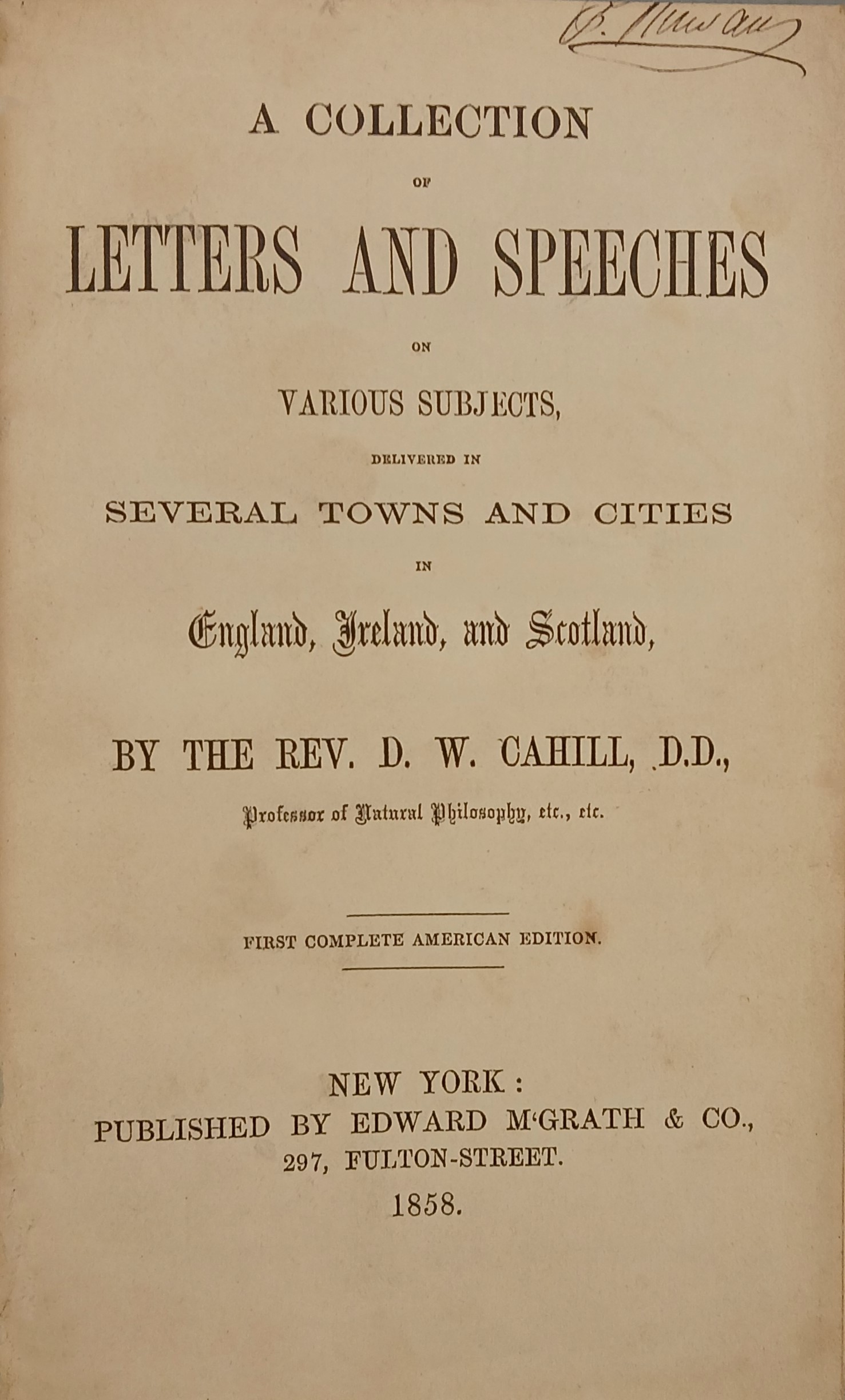 A copy of ‘A collection of letters and speeches on various subjects, delivered in several towns and cities in England, Ireland, and Scotland / by the Rev. D.W. Cahill’ (New York: published by Edward M’Grath & Co., 1858).