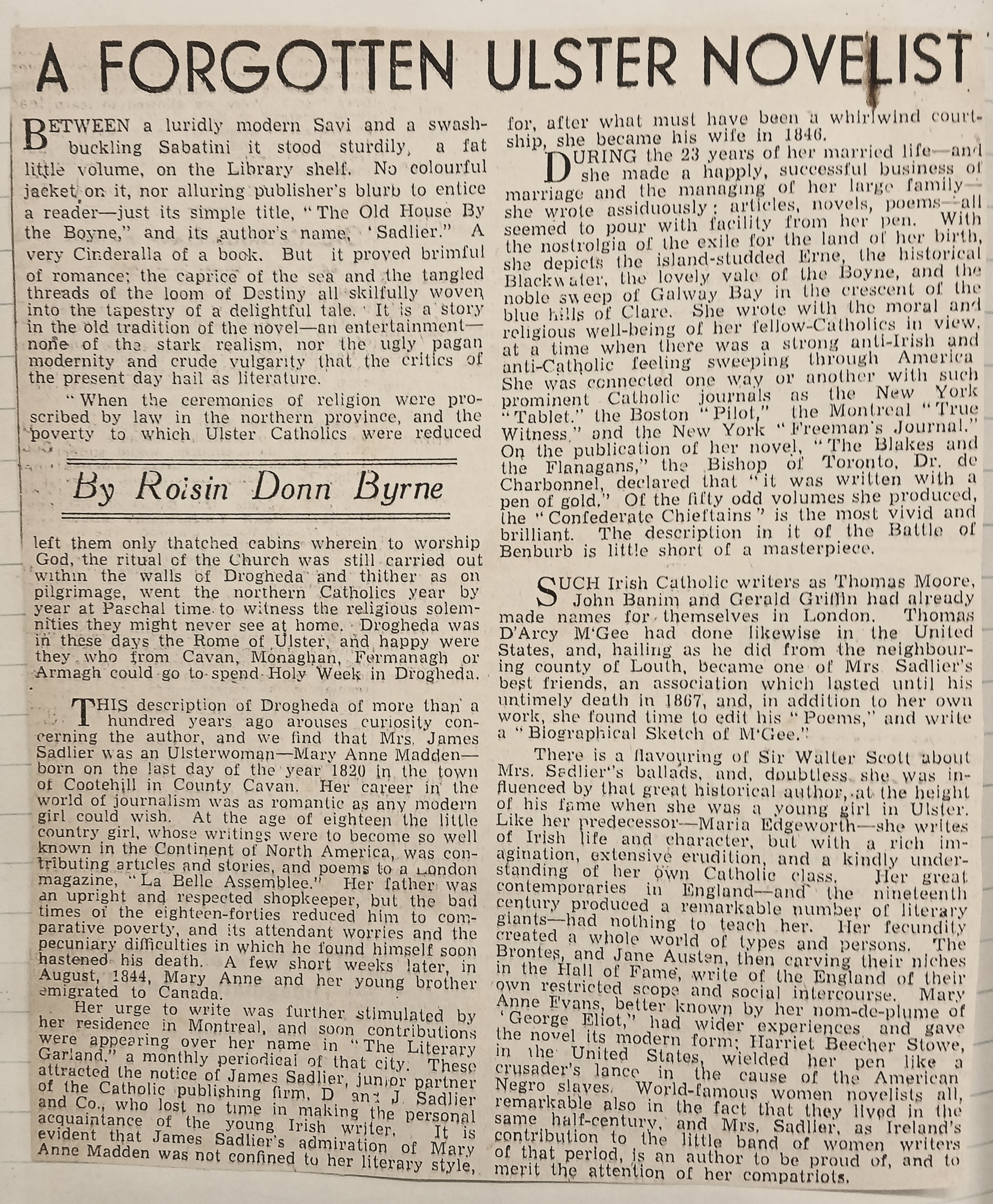 A clipping of an article by Roisin Donn Byrne on the Irish-Canadian novelist and short-story writer Mary Anne Sadlier. The date and the publication from which the clipping was taken is not given.