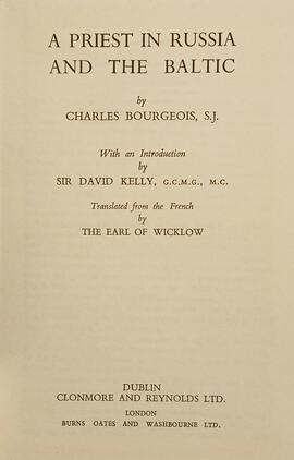 A copy of ‘A priest in Russia and the Baltic by Charles Bourgeois SJ / With an introduction by Sir David Kelly, translated from the French by the Earl of Wicklow’ (Dublin: Clonmore and Reynolds, [1953]).