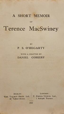 A copy of ‘A short memoir of Terence MacSwiney / by P. S. O’Hegarty / with a chapter by Daniel Corkery’ (Dublin: Talbot Press, 1922).