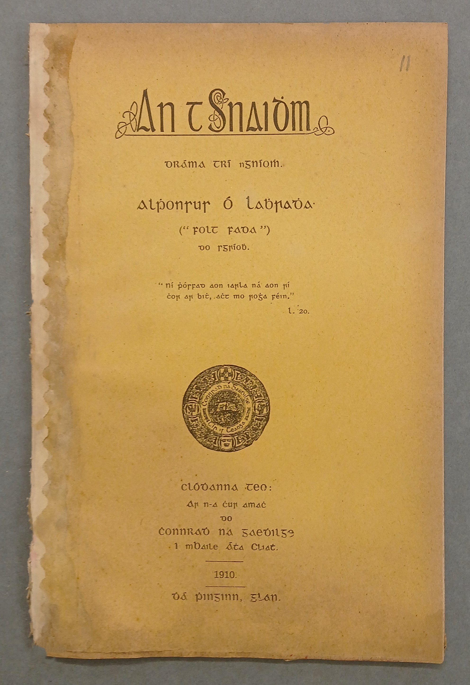 A copy of Alponsus Ó Labhradha, ‘An tsnaidhm / dráma trí ngníomh’ (Baile Átha Cliath: ar n-a chur amach do Connradh na Gaedhilge, 1908).