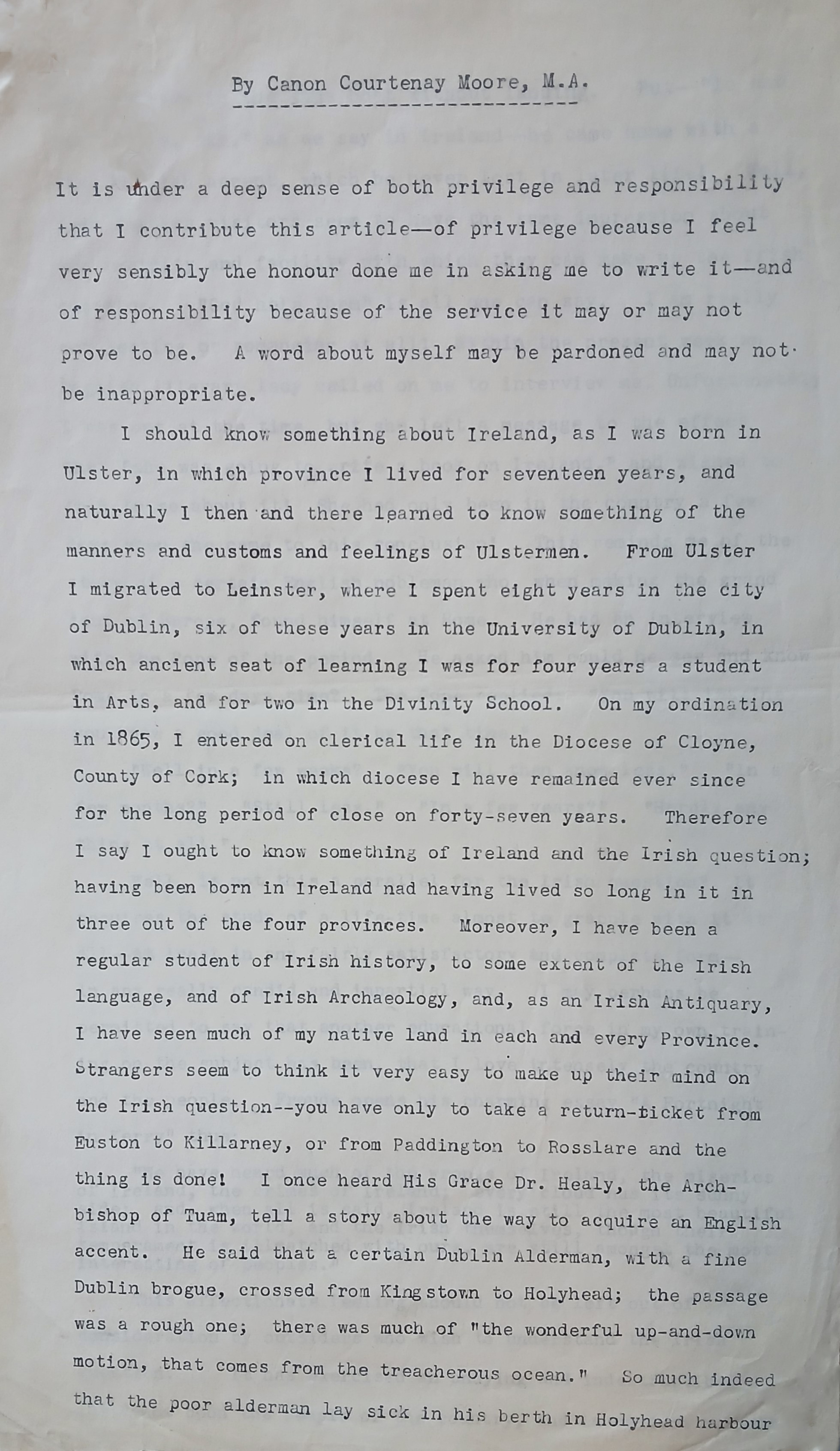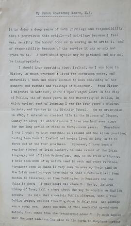 A typescript copy of an article by Canon Courtenay Moore (1842-1922). The article addresses the subjects of Home Rule, politics and religion in Ireland.