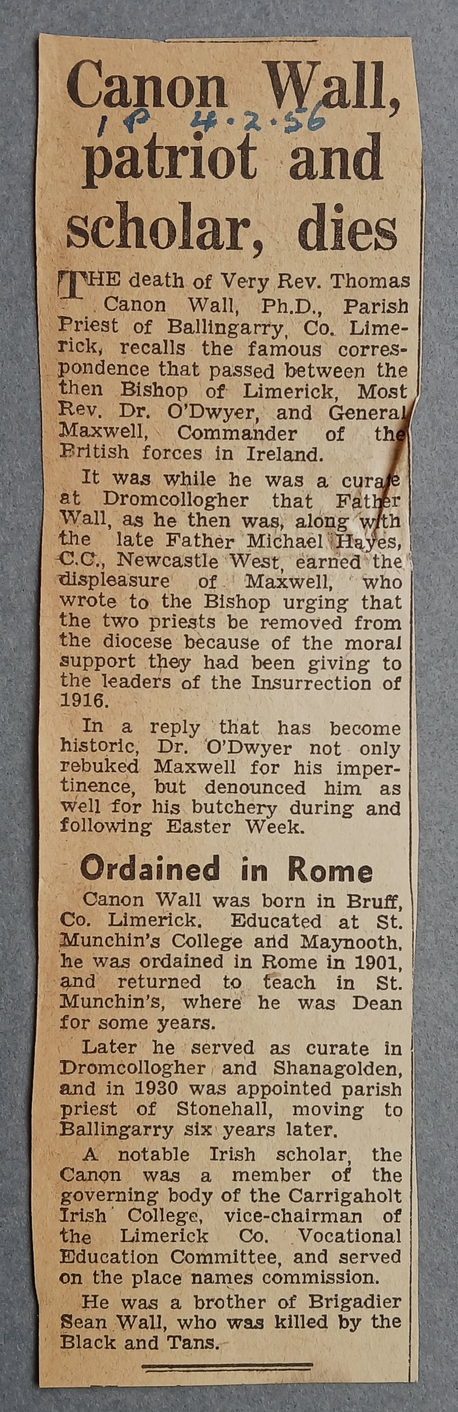 A clipping of a report on the death of Canon Thomas Wall, parish priest of Ballingarry in County Limerick. The clipping is taken from the ‘Irish Press’ (4 February 1956).