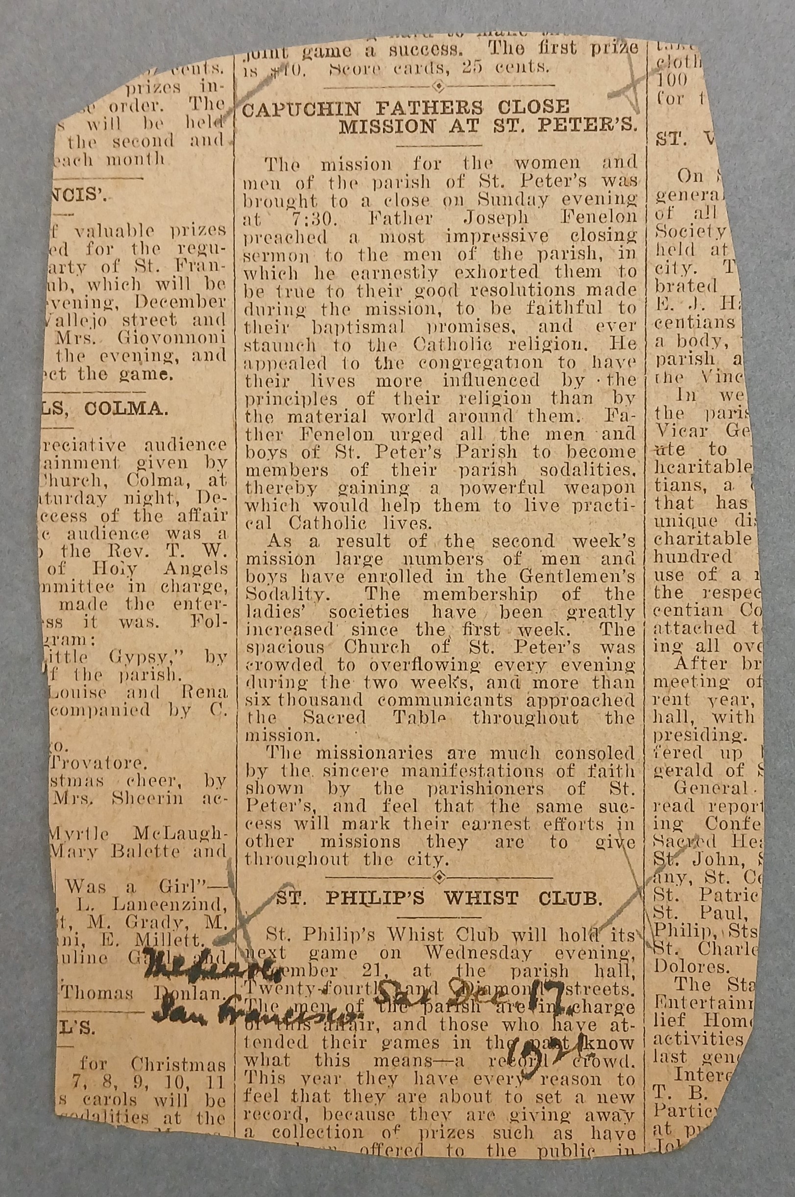 A clipping of an article describing the conclusion of a two-week religious mission at St. Peter’s Church in San Francisco led by Father Joseph Fenelon OFM Cap. It notes that over 6,000 communicants attended and highlights the ‘impressive’ closing sermon urging parishioners to stay true to their faith over material world influences. The clipping is likely taken from ‘The Monitor’, the official newspaper of the Archdiocese of San Francisco.