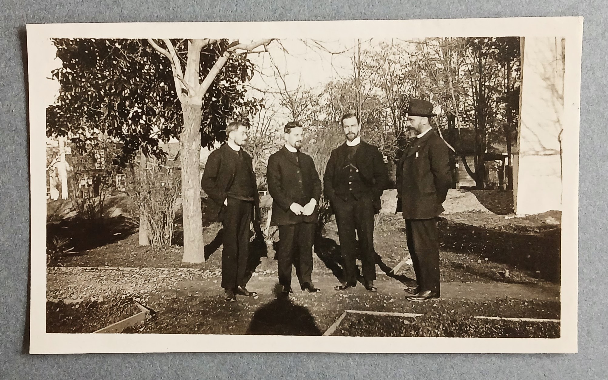 Photograph of a group of four Capuchin Friars in California. A manuscript annotation on the reverse reads ‘Some familiar faces, 1923’. The group includes Fr. Anthony Holmes OFM Cap. and Fr. Raphael Quinn OFM Cap.