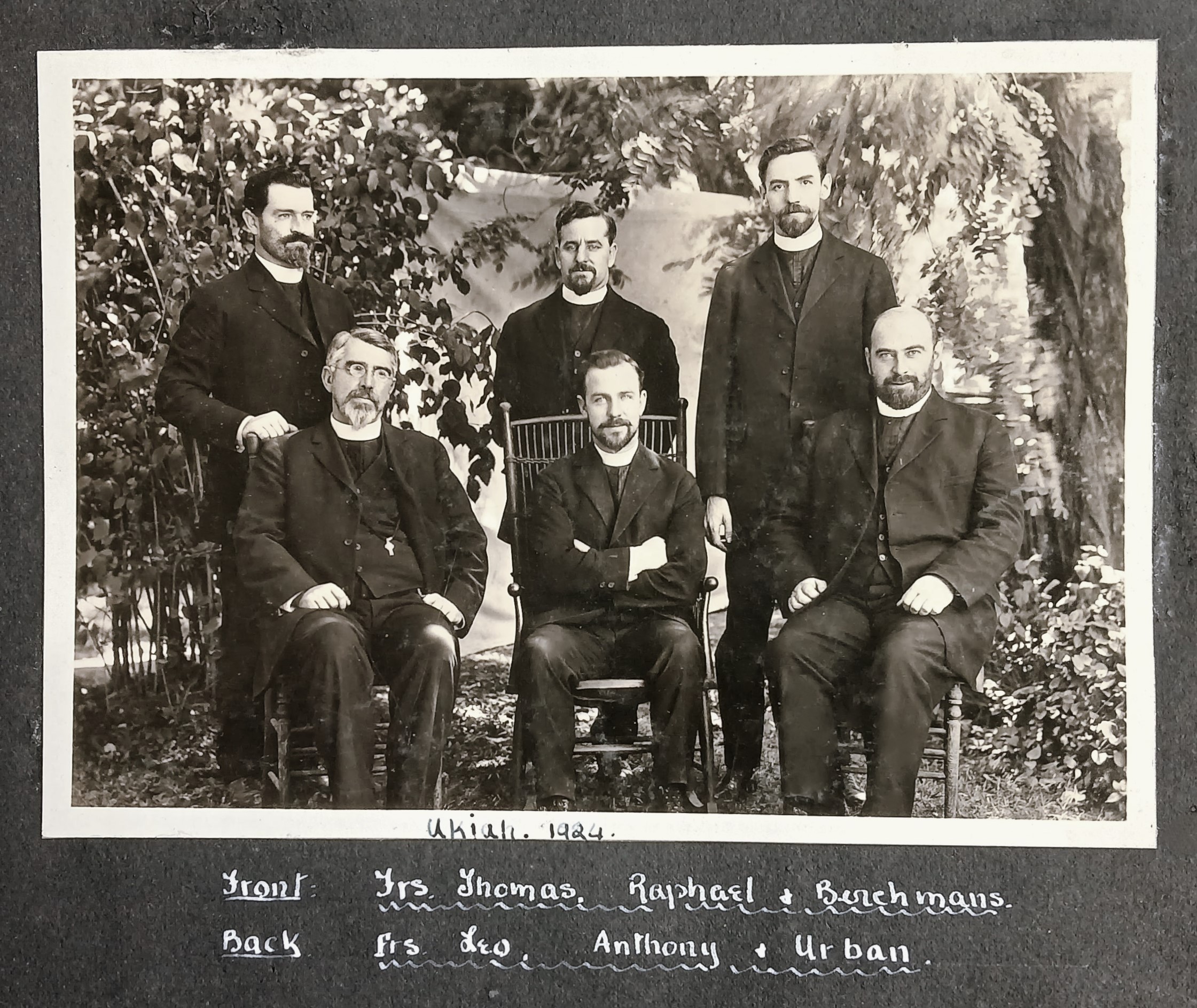 A group of Irish Capuchin friars in Ukiah, California. The group comprises Fr. Thomas Dowling OFM Cap., Fr. Raphael Quinn OFM Cap., Fr. Berchmans Cantillon OFM Cap., Fr. Leo Sheehan OFM Cap., Fr. Anthony Holmes OFM Cap., and Fr. Urban Riordan OFM Cap.