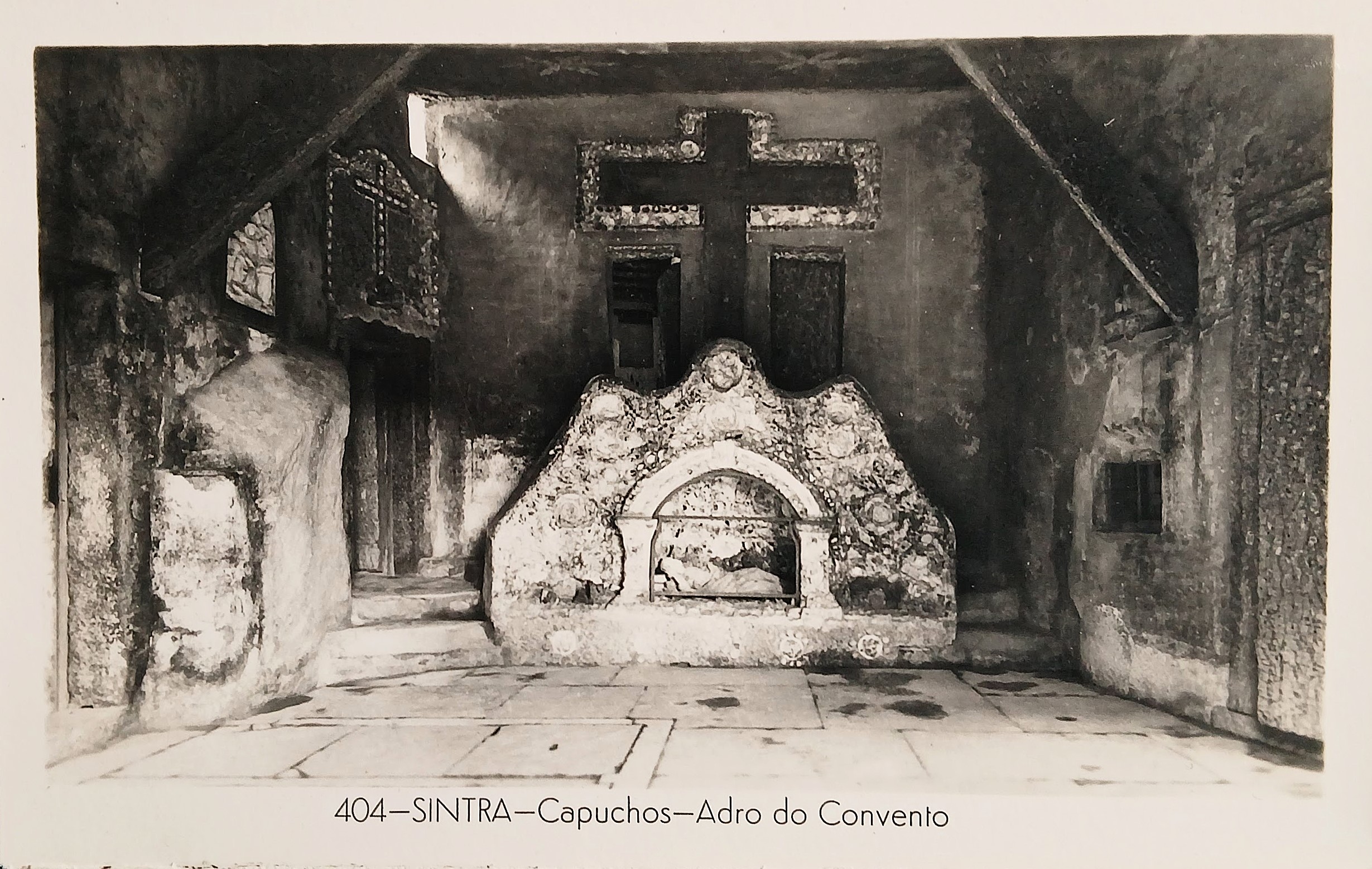 A postcard image of the interior of the ‘Convento dos Capuchos’ (Convent of the Capuchins) in the Sintra Municipality in Portugal. The friary is also known as the ‘Convento da Santa Cruz da Serra de Sintra’ (Convent of the Holy Cross of the Sintra Mountains).