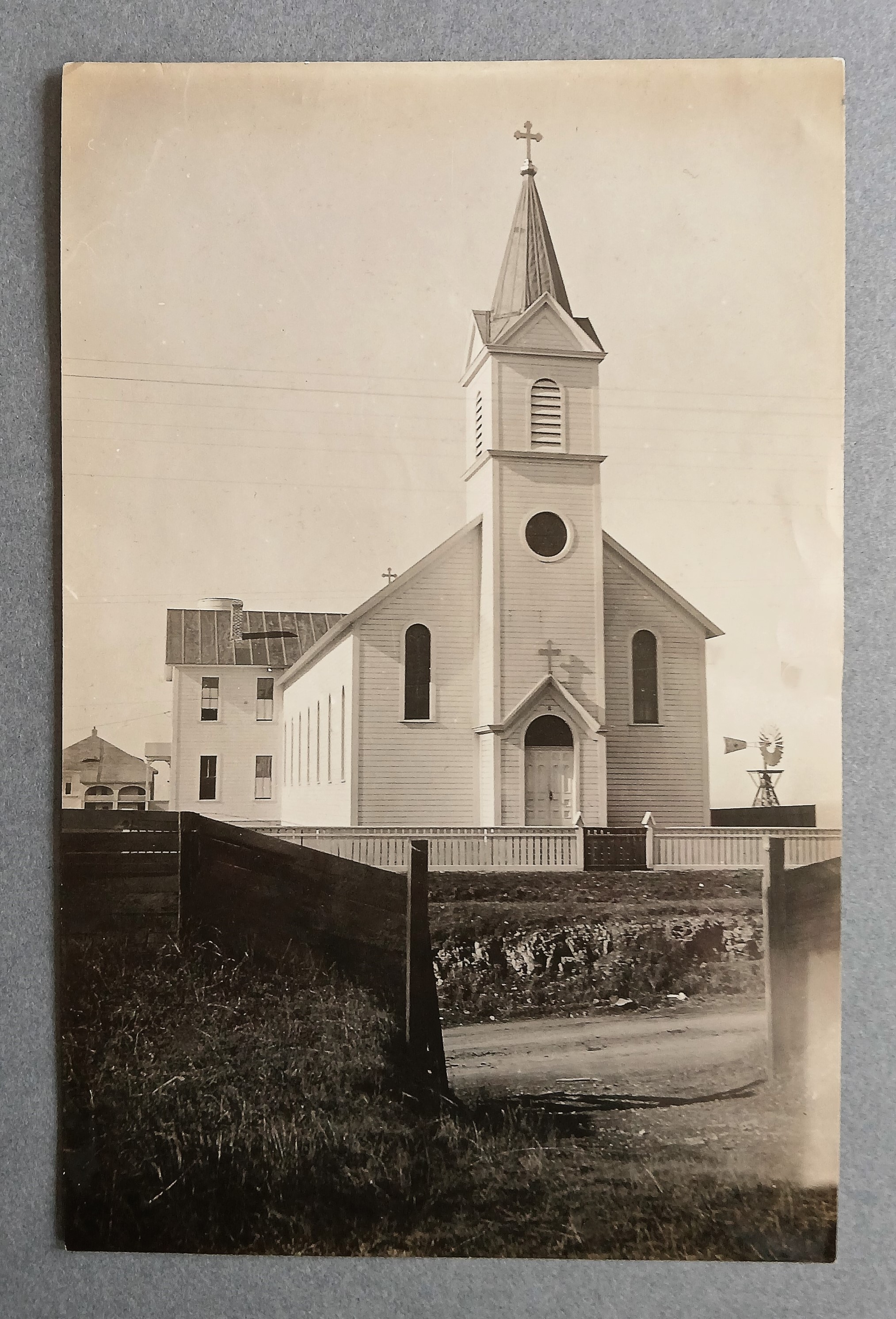Photograph of the exterior of the Church and Friary at Mendocino in California. A manuscript annotation on the reverse of the print reads ‘Mendocino Church that was burned down’. This church was destroyed by fire in 1930.