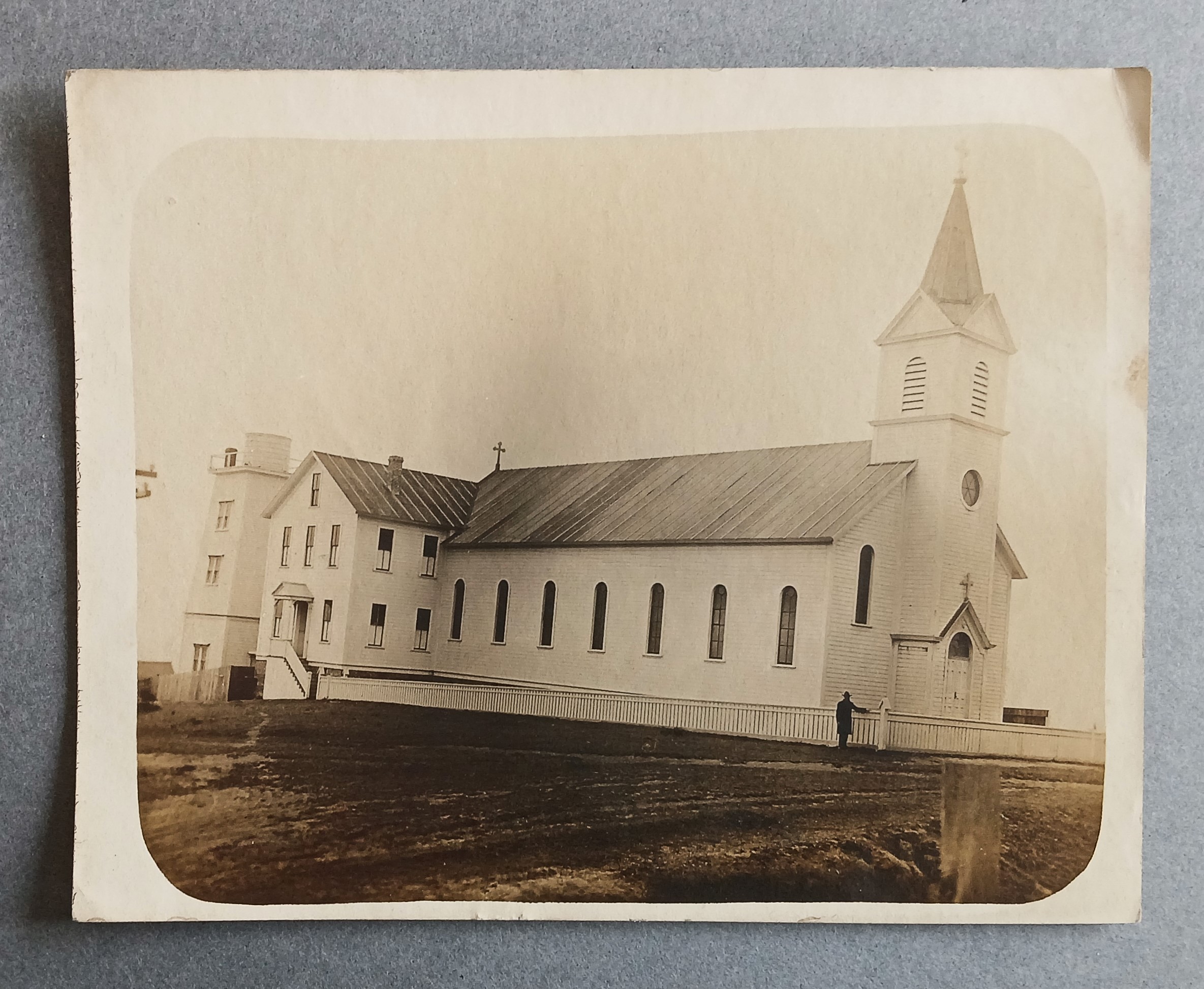 Photograph of the exterior of the Church and Friary at Mendocino, California. A manuscript annotation on the reverse of the print reads ‘Our church and monastery at Mendocino, Br. Anthony (Third Order), standing outside. Wooden buildings’. This church was destroyed by fire in 1930.