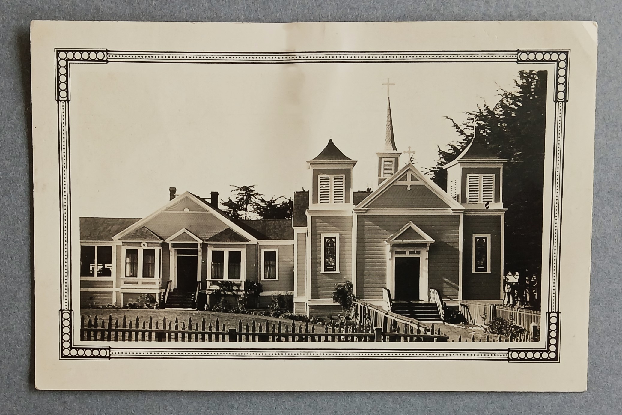 Photograph of the exterior of the Church of the Blessed Sacrament and adjoining rectory at Elk, California. Manuscript annotation on the reverse reads ‘Church and house, Elk, California’.