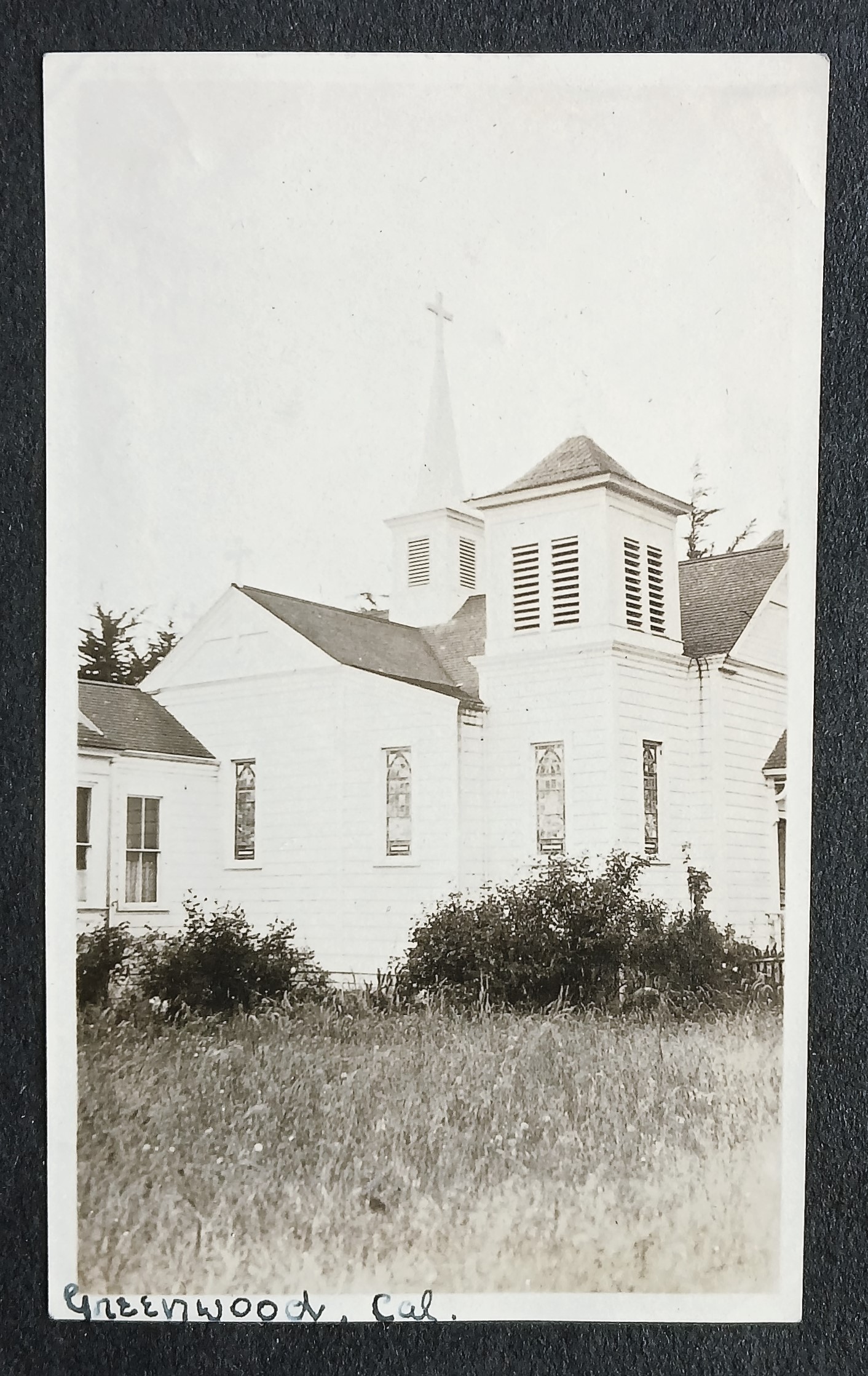 Photograph of the exterior of the Church of the Blessed Sacrament and adjoining rectory at Greenwood (Elk), California.