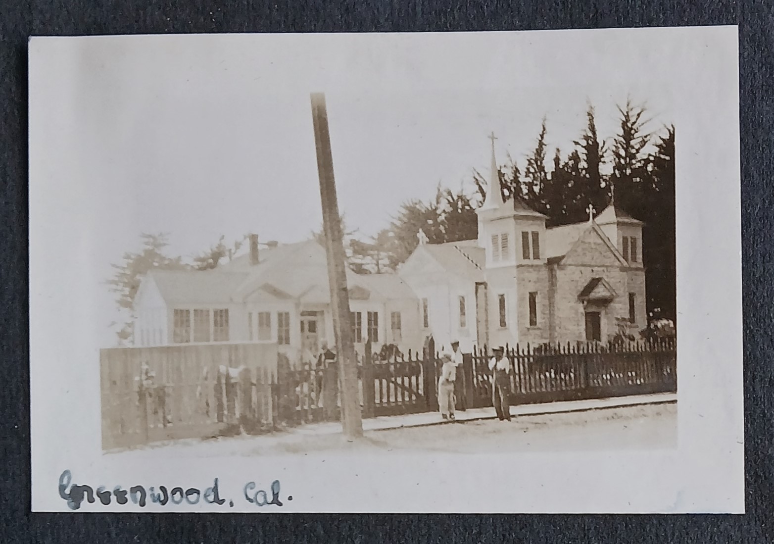 Photograph of the exterior of the Church of the Blessed Sacrament and adjoining rectory at Greenwood (Elk), California.