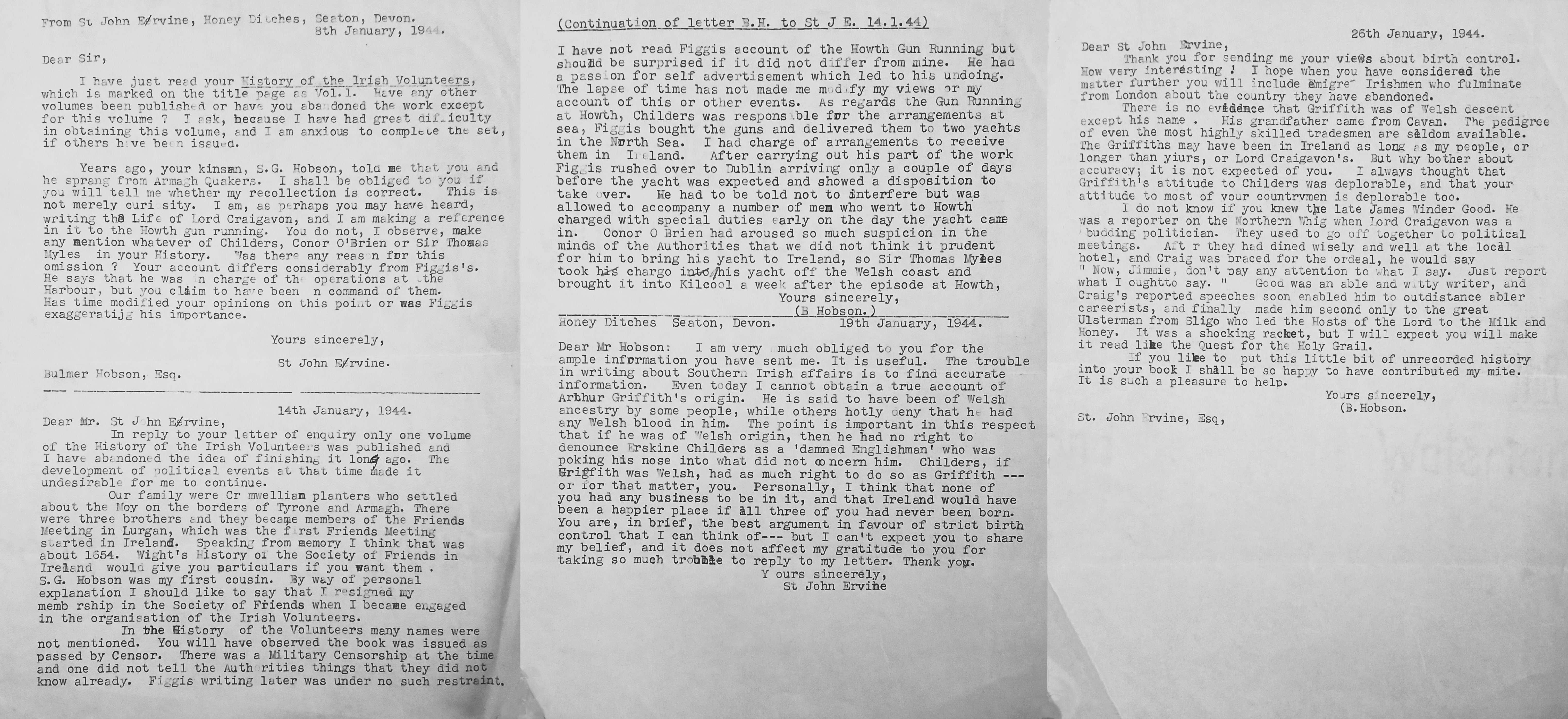 Copies of correspondence between St. John Greer Ervine and Bulmer Hobson mainly relating to events in the Irish revolutionary period. The topics include the Irish Volunteers, the Howth gunrunning, and Arthur Griffith’s ancestry.