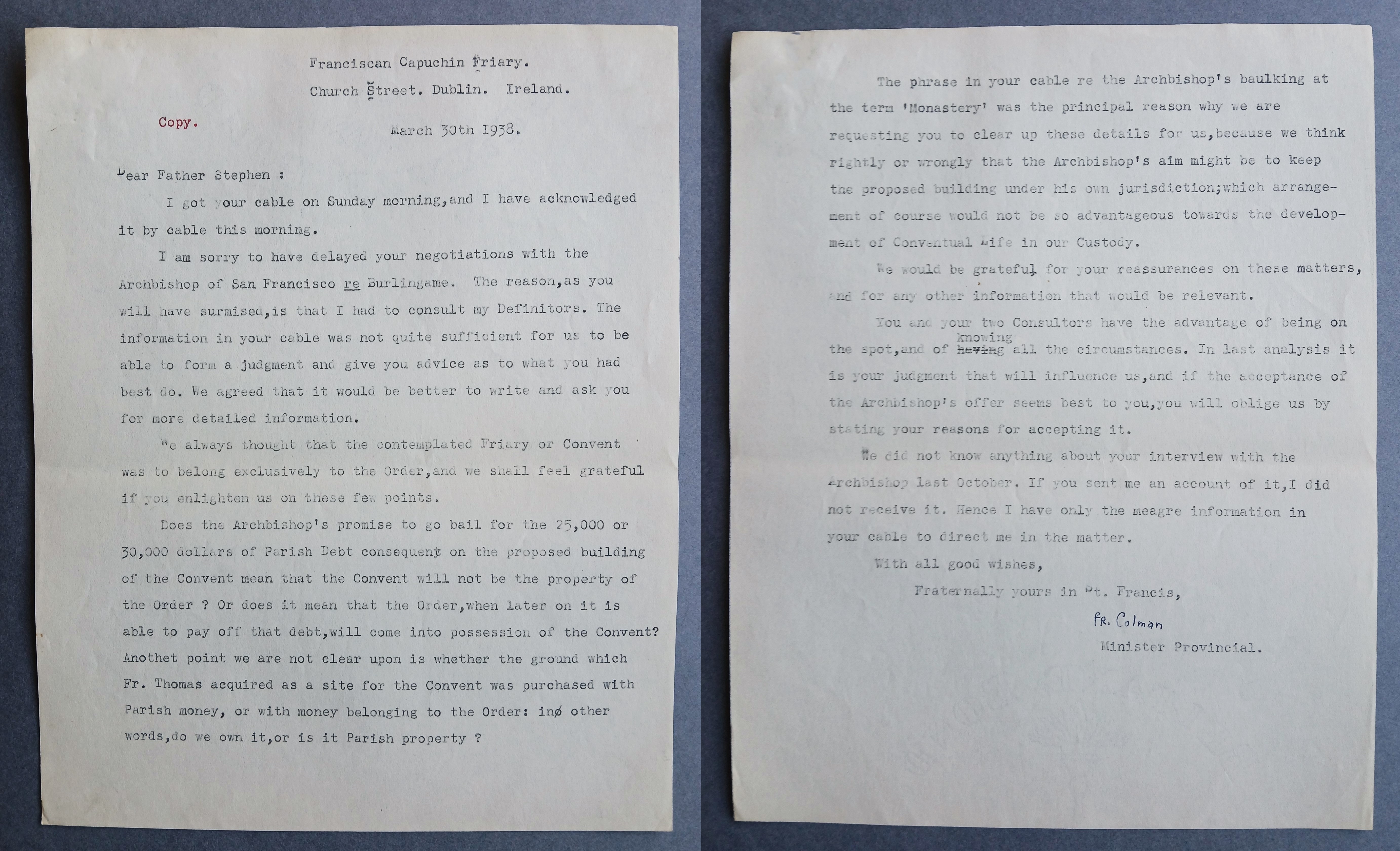Copy letter from Fr. Colman Griffin OFM Cap., Provincial Minister, to Fr. Stephen Murtagh OFM Cap. seeking clarification on several critical points regarding the negotiations with the Archbishop of San Francisco. Father Colman is concerned that the Archbishop’s hesitation regarding the term ‘monastery’ implies he wants the building under his jurisdiction rather than the exclusive ownership of the Capuchin Franciscan Order. He asks if the Archbishop’s promise to cover $25,000 to $30,000 in debt means the property will eventually belong to the Order once the debt is paid, or if it remains ‘Parish property’.