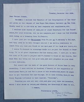 Copy letter from Fr. Peter Bowe OFM Cap., Provincial Minister, to Fr. Joseph Fenelon OFM Cap. referring to the rescript for the Capuchin foundation at Mission Santa Inés in California. He also references St. Anthony’s College in Mendocino County and Fr. Bernard Clery’s efforts to establish a school in Roseburg, Oregon.