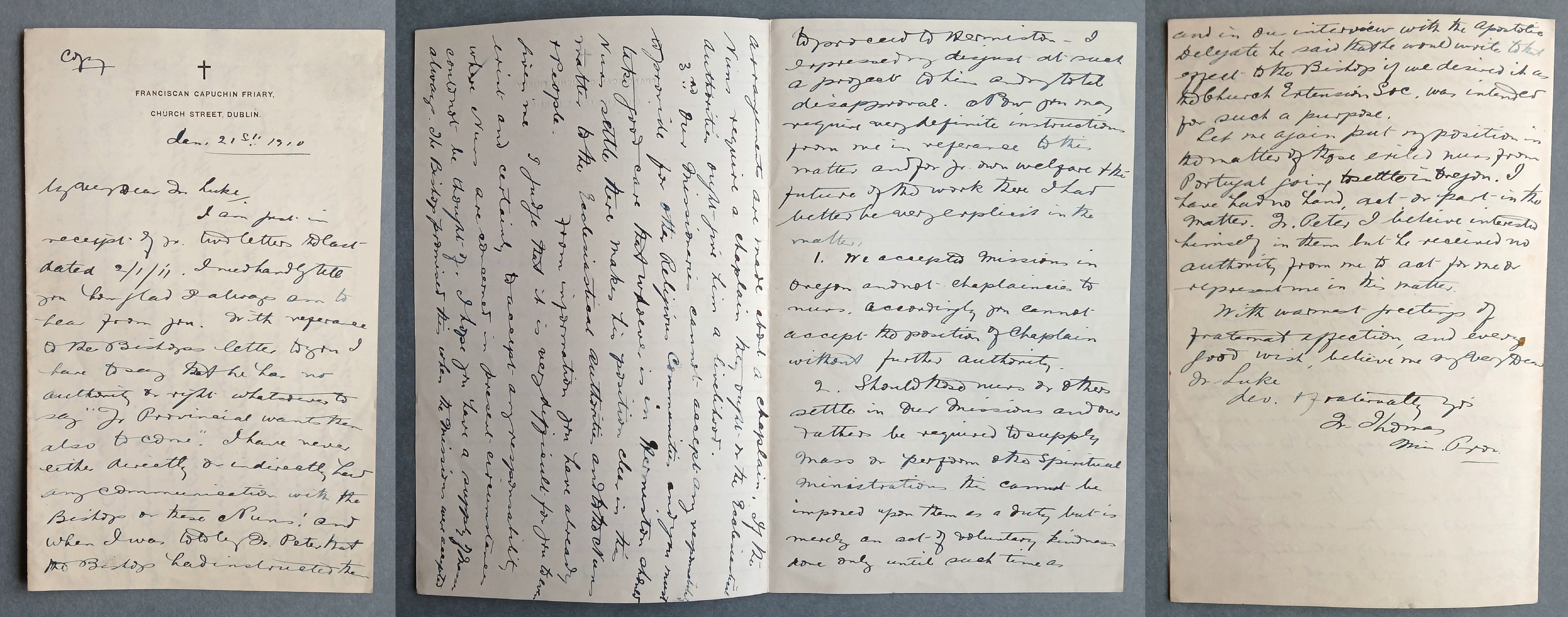 Copy letter from Fr. Thomas Dowling OFM Cap. to Fr. Luke Sheehan OFM Cap. expressing his dismay on some of the instructions given to Fr. Luke by the Bishop of Baker City. He writes ‘We accepted missions in Oregon and not chaplaincies to nuns. Accordingly, you cannot accept the position of chaplain without further authority. Should these nuns or others settle in our missions and our fathers be required to supply Mass or perform other spiritual ministrations this cannot be imposed upon them as a duty but is merely an act of voluntary kindness done only until such time as arrangements are made about a chaplain’.