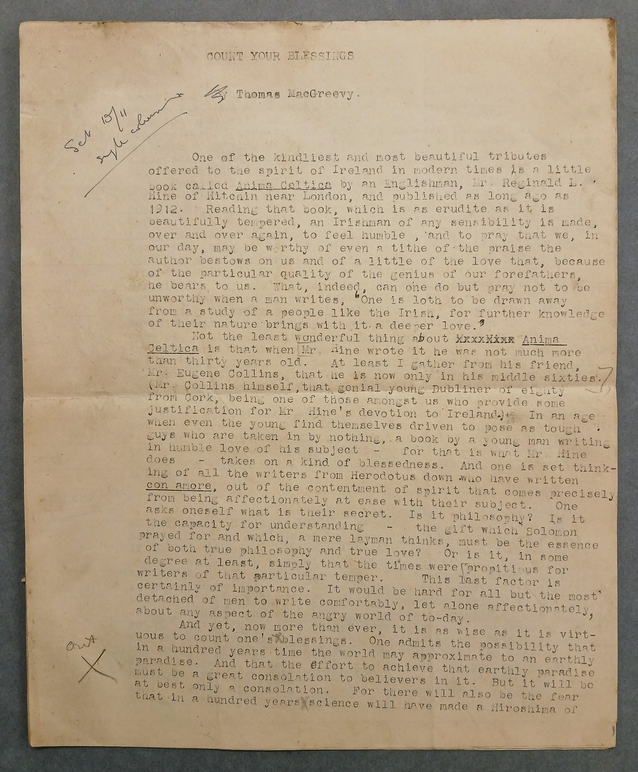 A draft copy of an article titled ‘Count your Blessings’ by Thomas MacGreevy. The article was published in the ‘Irish bookman’, Vol. I, (August 1946), pp 43-52.