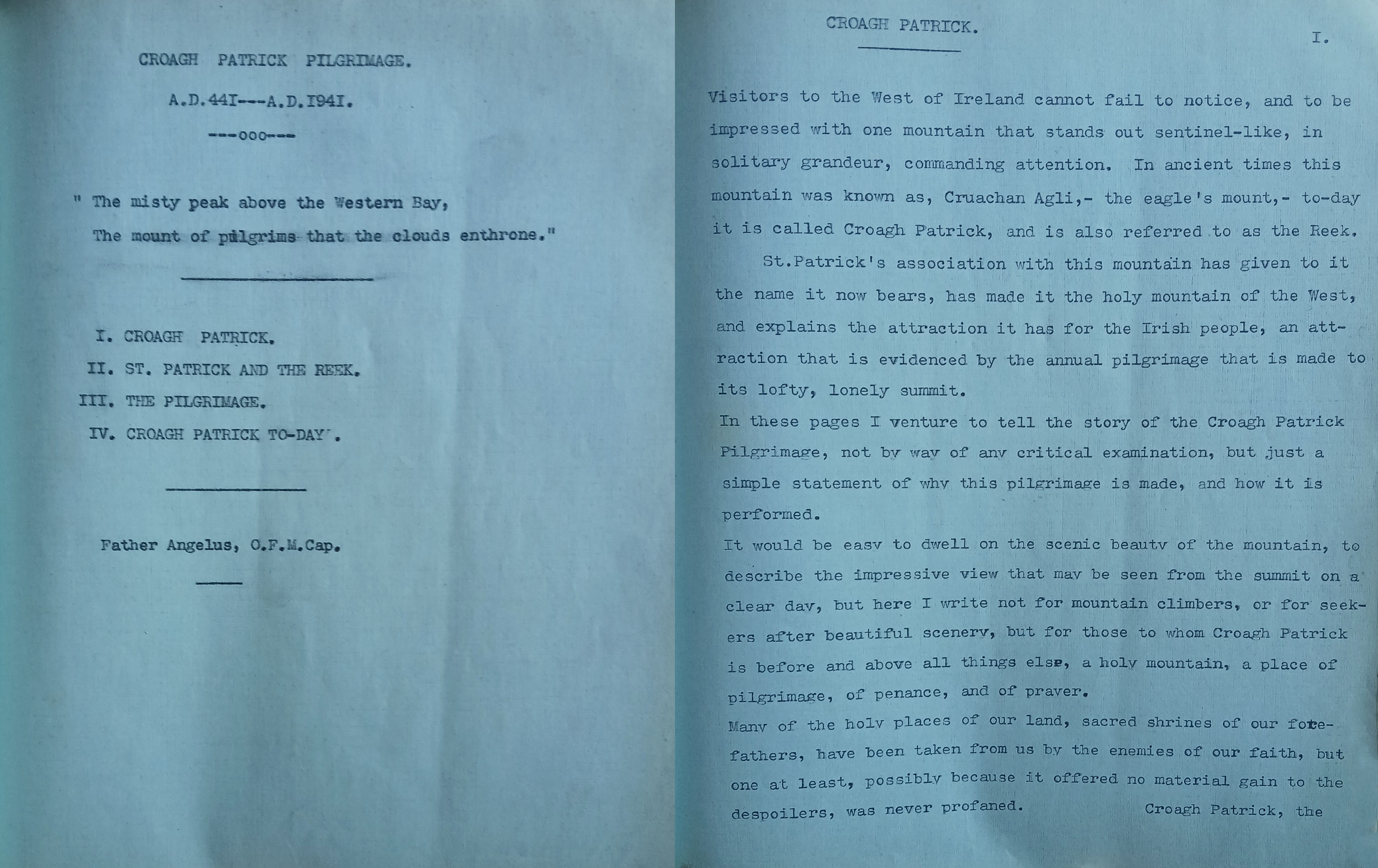 A bound volume containing an article draft titled ‘Croagh Patrick Pilgrimage / A.D. 441-A.D. 1941’. The article was written by Fr. Angelus Healy OFM Cap. and assesses the historical significance of the Croagh Patrick Pilgrimage in County Mayo. Fr. Angelus wrote ‘At the risk of appearing egotistical, but as a justification of my writing these pages, I may mention that my experience of Croagh Patrick goes back to the year 1906, when I climbed it for the first time, and that every year since, with only two exceptions, I have taken part in the pilgrimage’. The article was probably intended for publication in a Capuchin periodical.