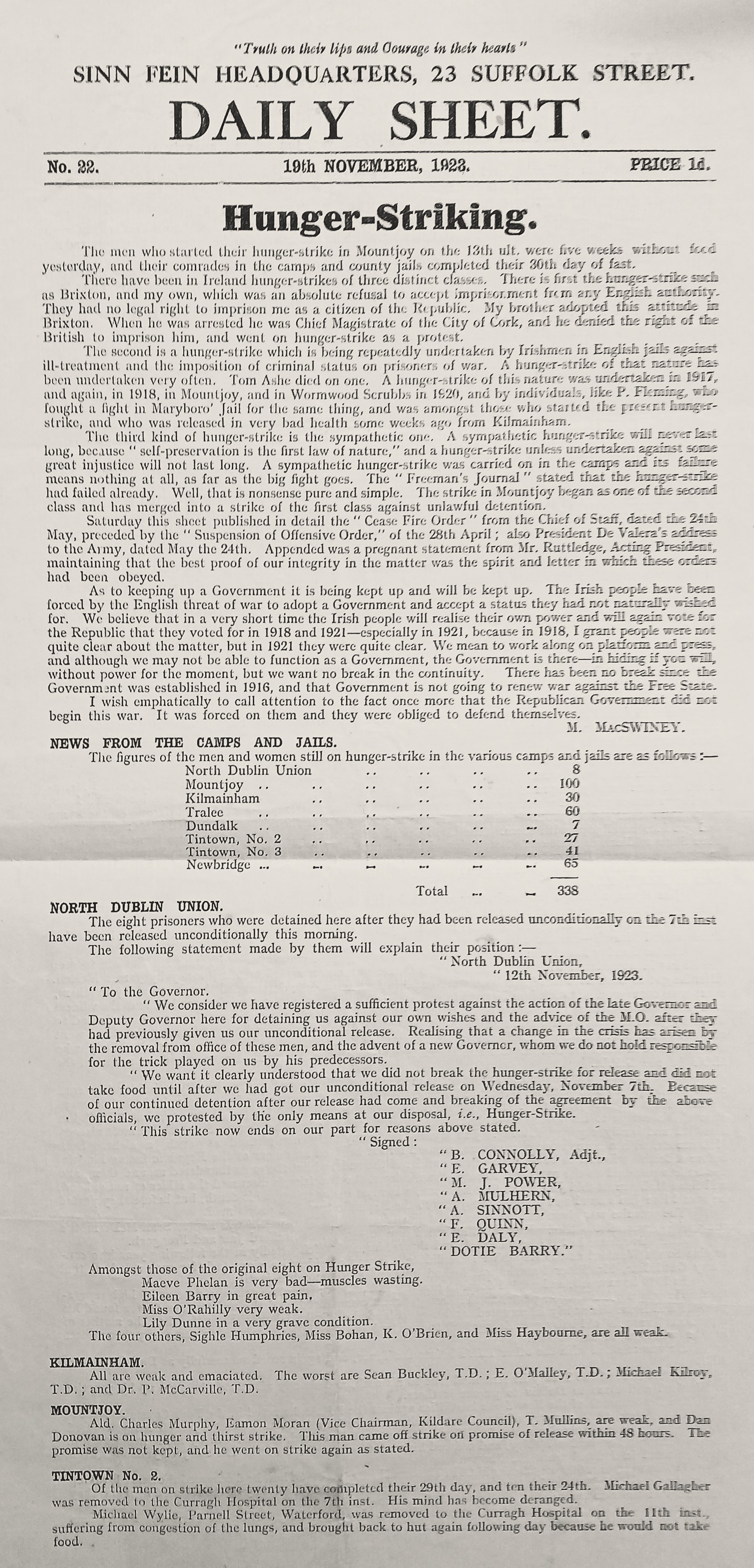 A ‘Daily Sheet’ produced by Sinn Féin (No. 22, 19 November 1923). The text outlines the plight of republican prisoners who have resorted to hunger-striking while being detained by the Free State authorities. Includes a piece by Mary MacSwiney, the sister of Terence MacSwiney.