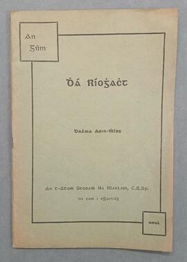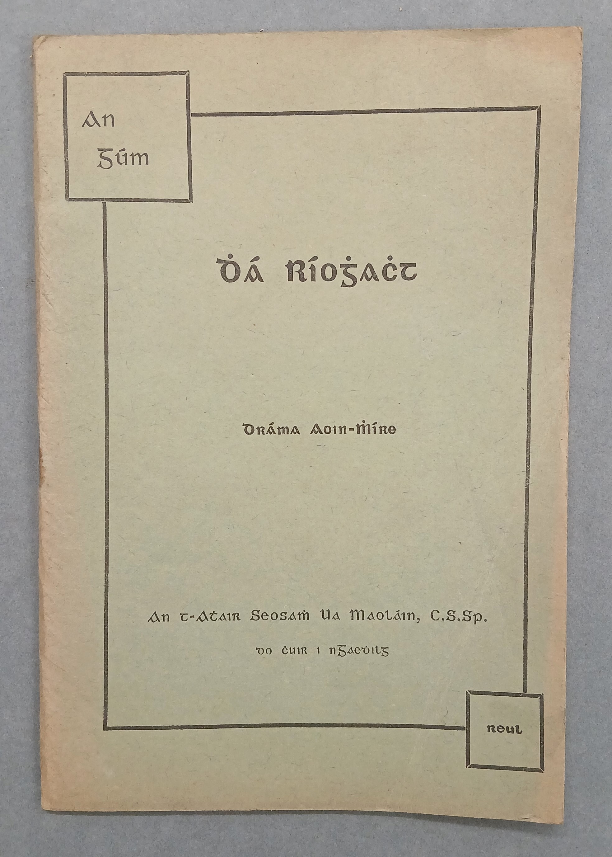 A copy of ‘Dhá Ríoghacht / Dráma aoin-mhire / an t-Athair Seosamh Ua Maoláin do chuir i nGaedhilg’ (Dublin: Oifig an tSolathair, 1944). An Irish translation of a text by Aodh de Blacam.