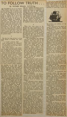 The volume was compiled by Fr. Senan Moynihan OFM Cap. and includes clippings taken from the ‘Irish Press’, ‘Irish Independent’, ‘Irish Times’ and other Irish and Northern Irish newspapers and magazines. The volume includes clippings of articles written by Fr. Senan reflecting on the Mother and Child scheme. Other clippings include articles by Professor Alfred O’Rahilly defending the church’s position in the Mother and Child scheme which were published in ‘The Standard’ newspaper. The volume also includes a letter from Seán MacBride and a copy typescript statement by him on Noel Browne’s resignation
