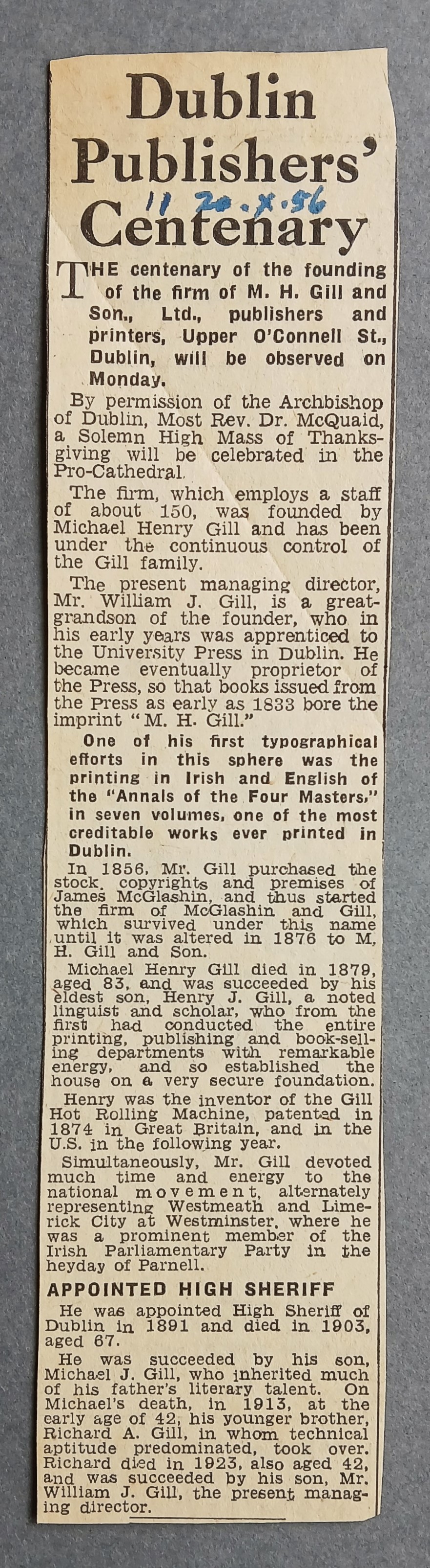 A clipping of an article reporting on the centenary of the founding of the publishing firm of M.H. Gill in Dublin. The clipping is taken from the ‘Irish Independent’ (20 October 1956).