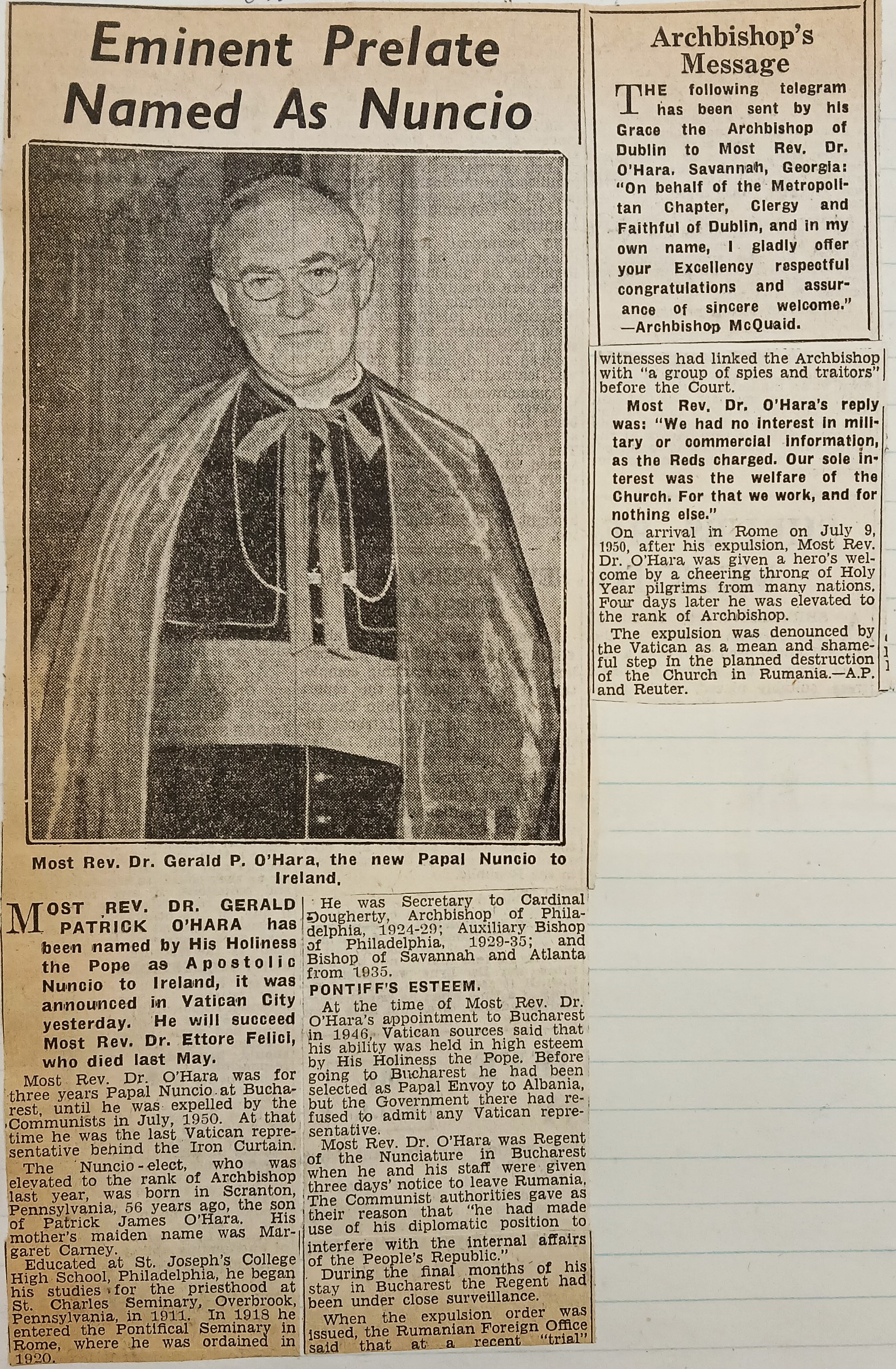 A clipping of an article on the appointment of Archbishop Gerald O’Hara as the new Apostolic Nuncio to Ireland. The clipping is taken from the ‘Irish Independent’ (28 November 1951).