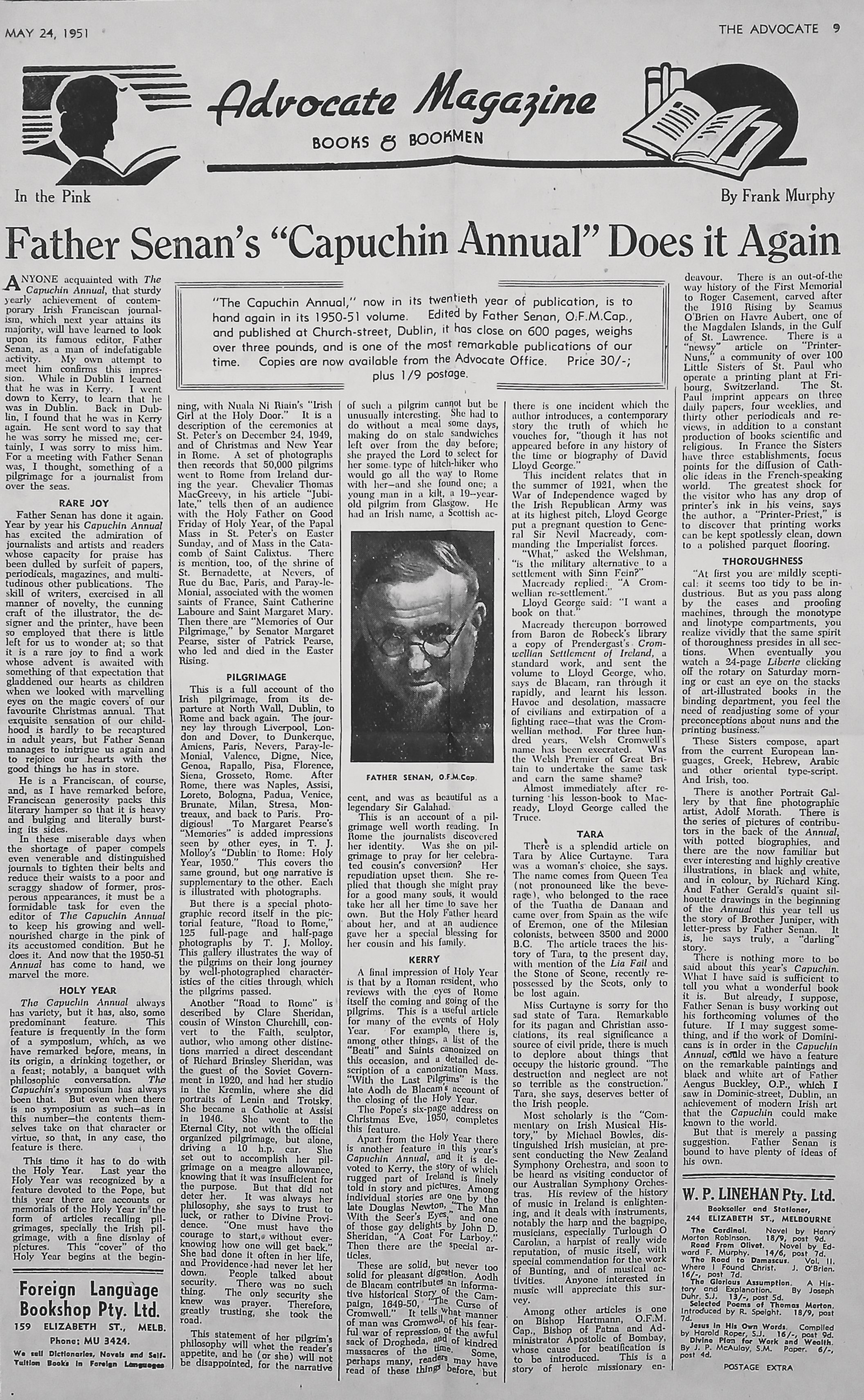 A clipping of a review of ‘The Capuchin Annual’ (1950-1) by Frank Murphy published in ‘The Advocate’ (24 Mary 1951). ‘The Advocate’ was published by the Catholic Archdiocese of Melbourne.