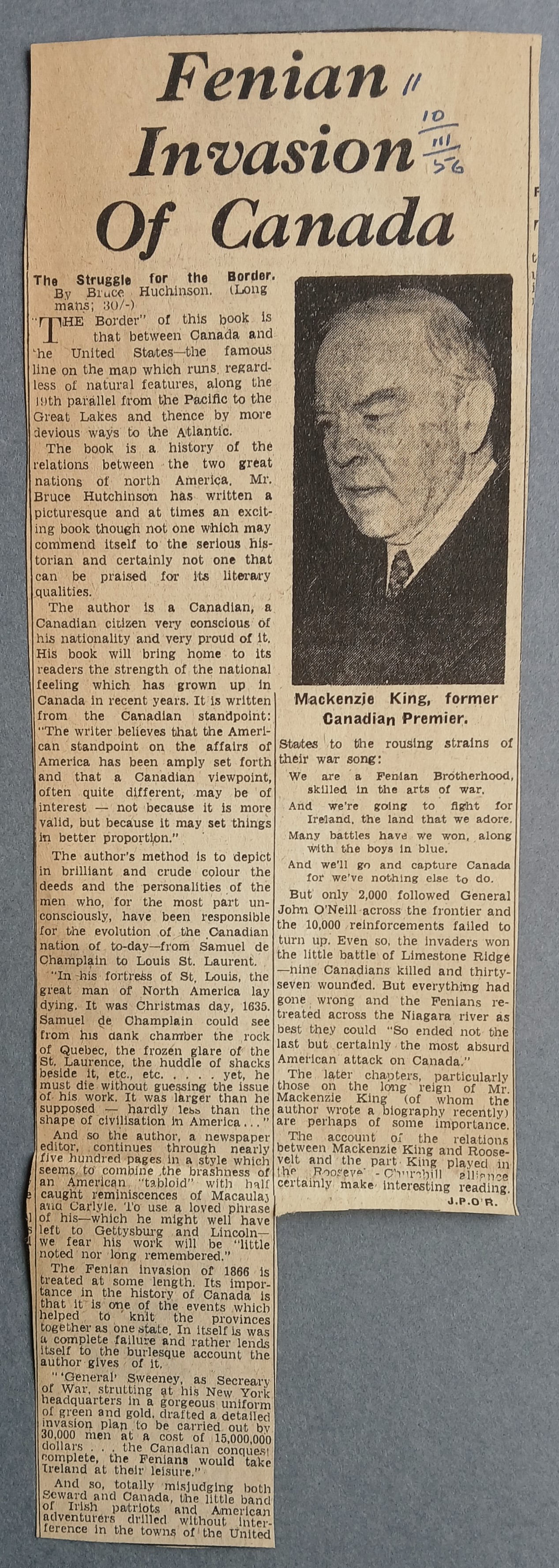 A clipping of a review of ‘The Struggle for the Border’, referencing the Fenian Invasion of Canada, by Bruce Hutchinson. The review was published in the ‘Irish Independent’ (10 March 1956).