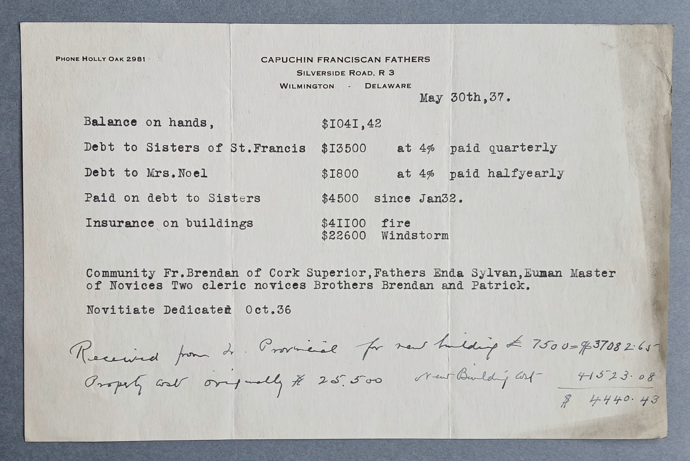 Financial Statement of the Capuchin Friary, Wilmington, Delaware. It documents the finances and community status of the Wilmington novitiate (a training house for new friars) following its dedication in October 1936. Handwritten notes indicate that the original property cost $25,500, while the new building cost $41,523.08.