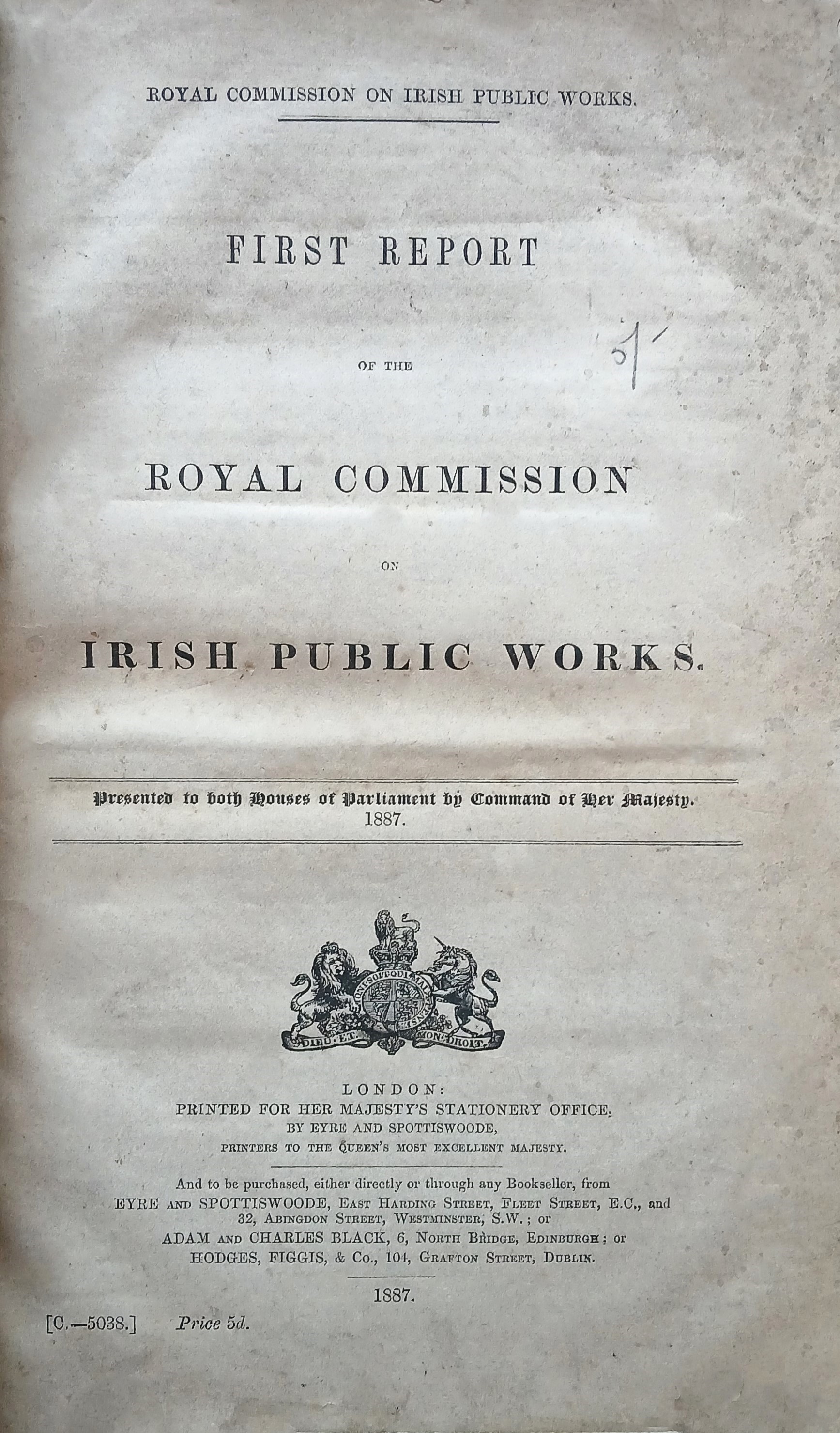 A copy of the ‘First Report of the Royal Commission on Irish Public Works / Presented to both Houses of Parliament’ (London, printed by Her Majesty’s Stationery Office, 1887). Includes the main report, its appendices, and the minutes of proceedings, evidence, and index. The report outlines measures pertaining to various infrastructure and public works and proposals for river drainage projects.