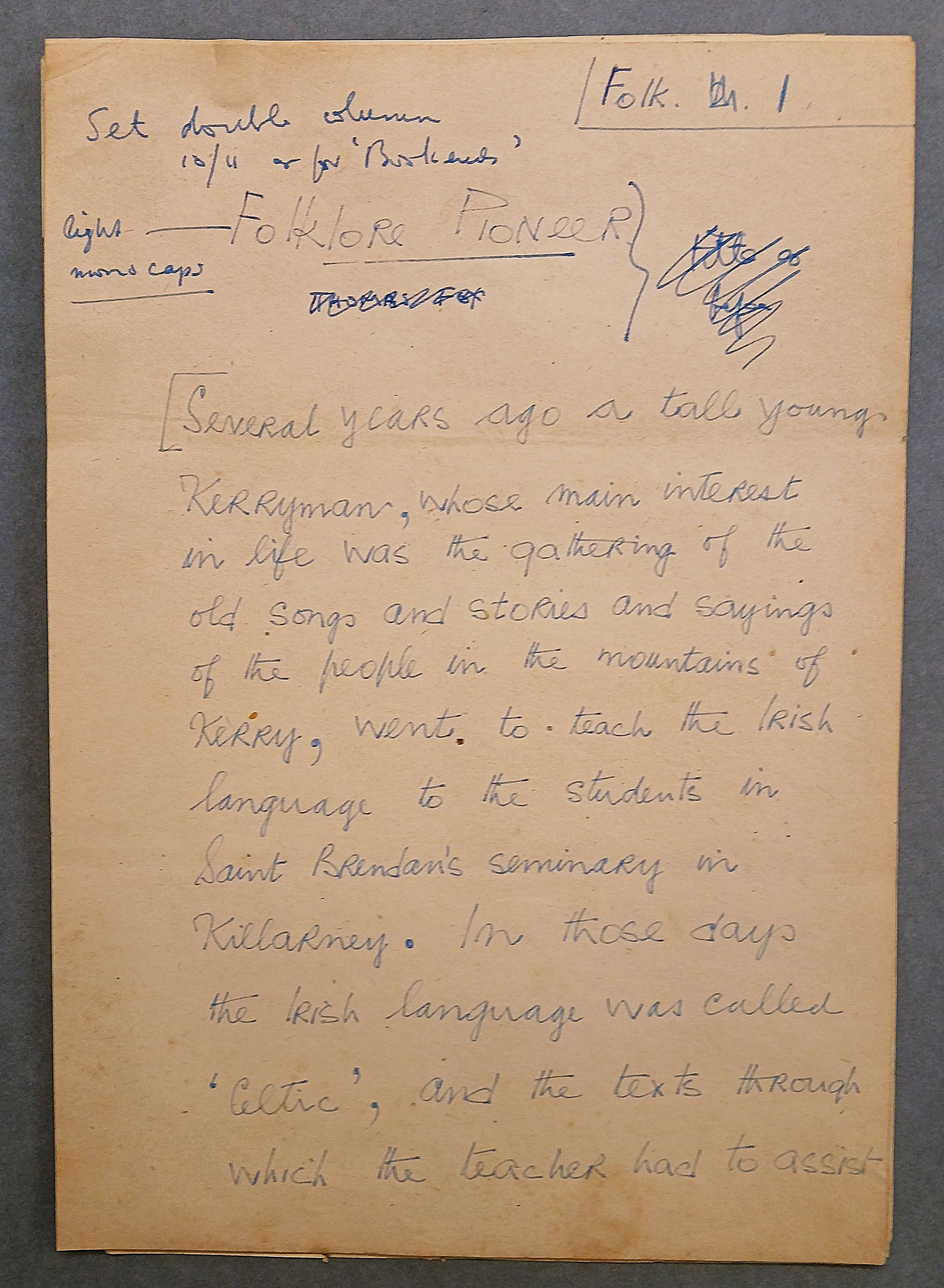 A draft of an article by Thomas Fox on the pioneering efforts of Irish folklore collectors. Reference is made to the work of Fr. Senan Moynihan’s close acquaintance Seosamh Ó Conchubhair (Joseph O’Connor) in County Kerry.