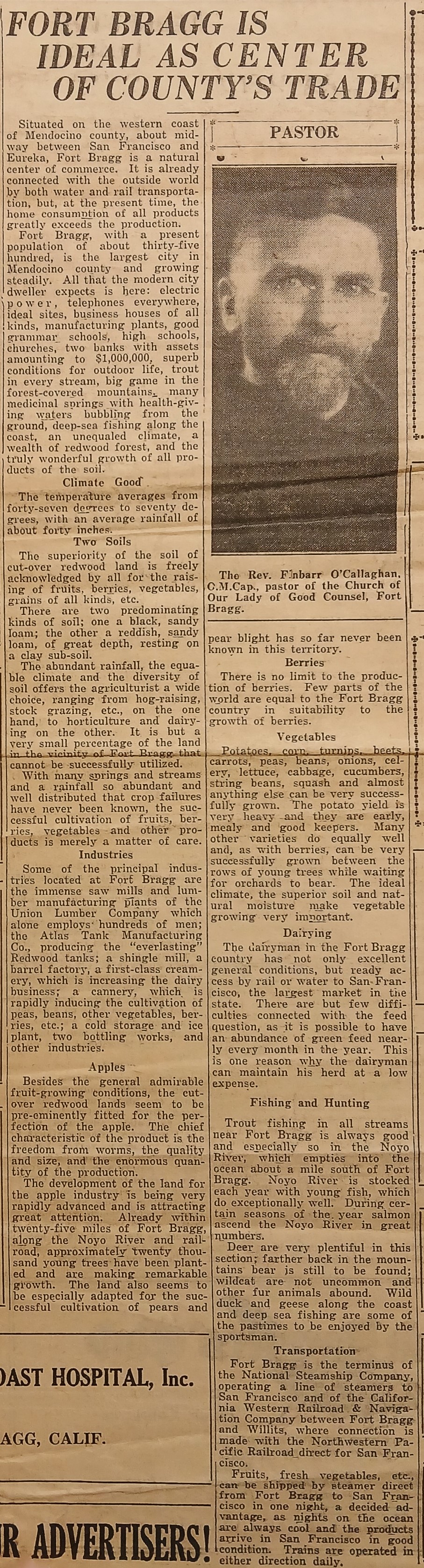 A clipping of an article detailing the economic and natural advantages of Fort Bragg, California. Reference is made to Fr. Finbarr O’Callaghan OFM Cap., who was the pastor of the Church of Our Lady of Good Counsel in Fort Bragg. The clipping is taken from ‘The Monitor’ (16 March 1929).