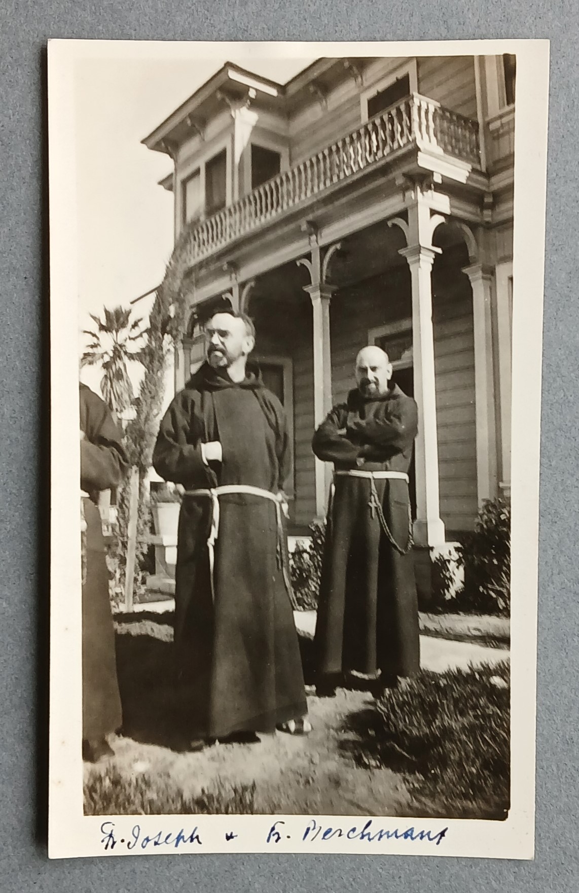 Photograph of Fr. Joseph Fenelon OFM Cap. and Fr. Berchmans Cantillon OFM Cap. outside the Capuchin friars’ residence in Watts, Los Angeles.