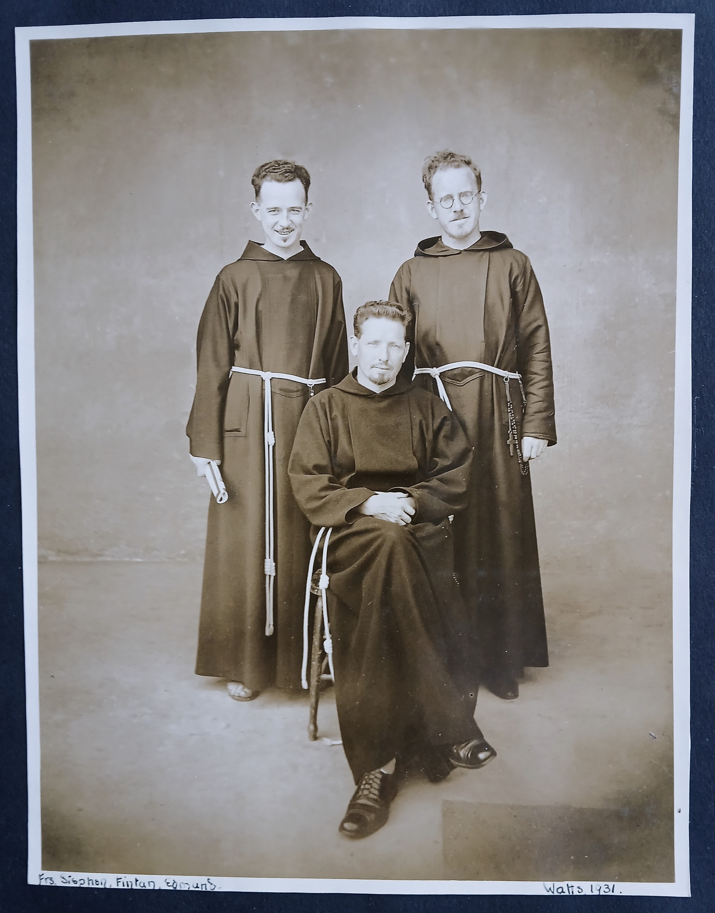 Studio photograph of (seated) Fr. Stephen Murtagh OFM Cap., (left, standing) Fr. Fintan Roche OFM Cap., and Fr. Edmund Hyland OFM Cap. in Watts, Los Angeles.