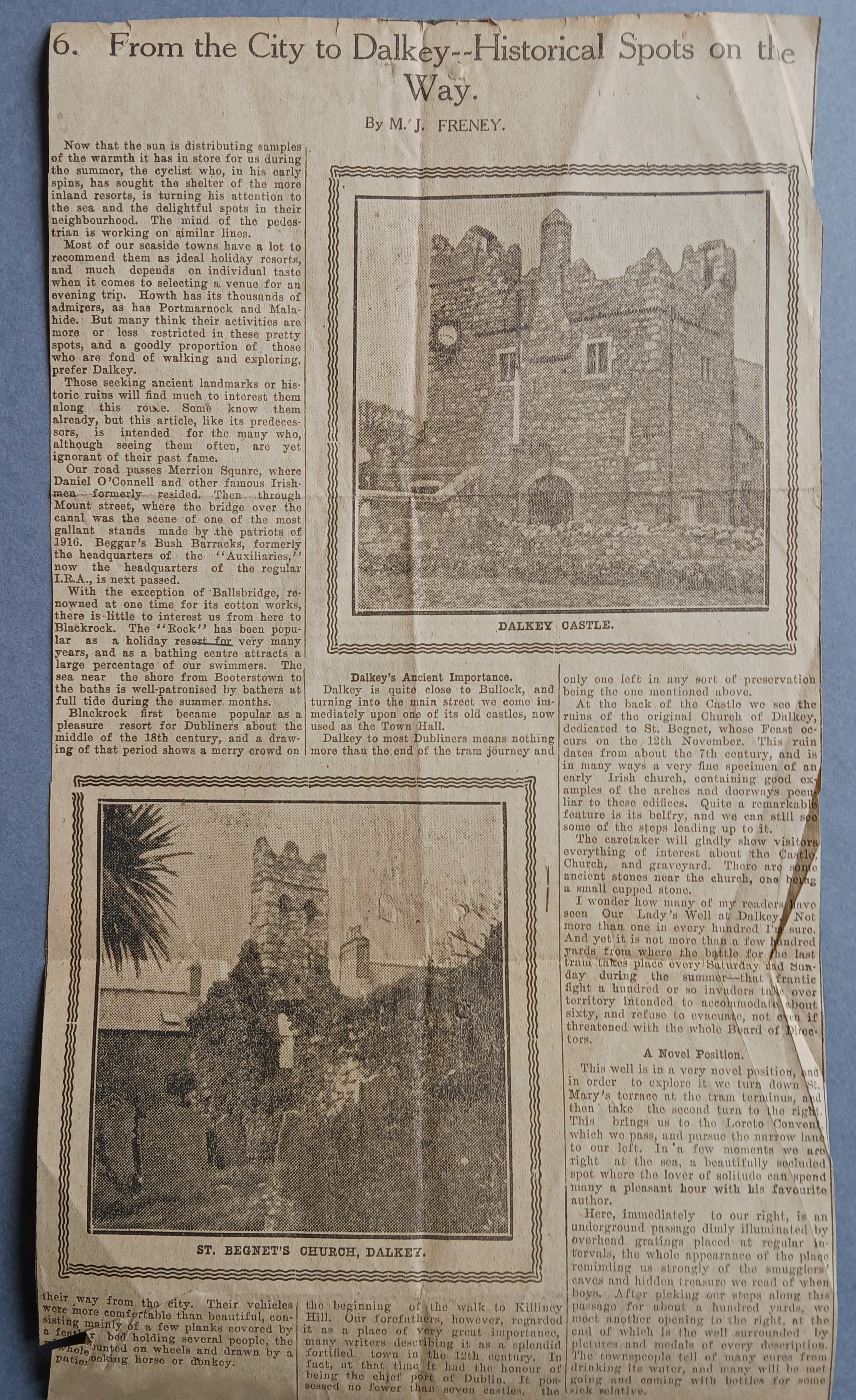 A clipping of an article by M.J. Freney titled ‘From the City to Dalkey / Historical Spots on the Way’. Includes images of Dalkey Castle, Bullock Castle, and St. Begnet’s Church. ‘Evening Telegraph’ (20 May 1922).