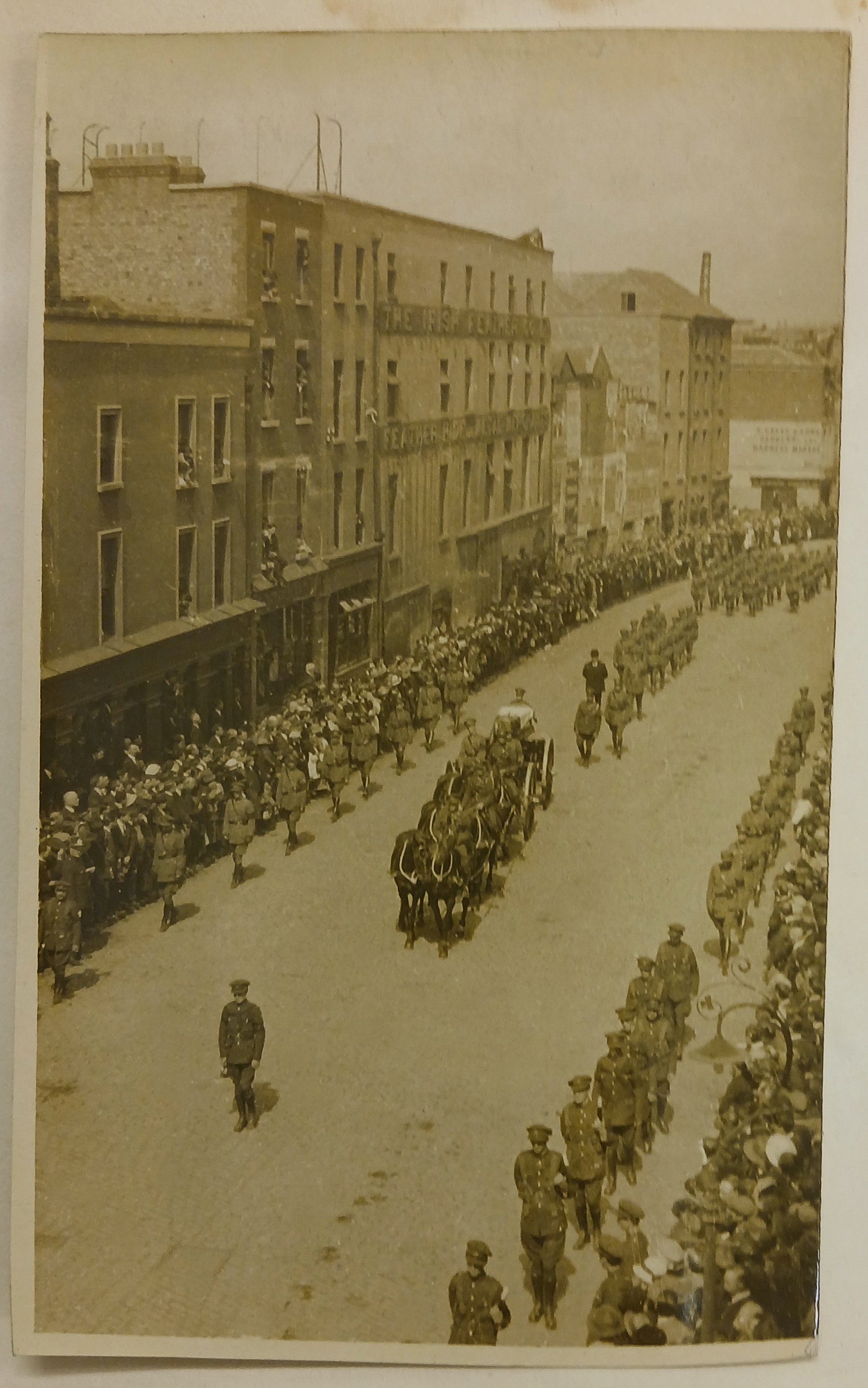 Photographic prints of the funeral procession of Michael Collins in Dublin on 28 August 1922. The volume contains thirteen images of the procession including images of Dublin Fire Brigade personnel and their horse-drawn vehicles and motor fire engines.