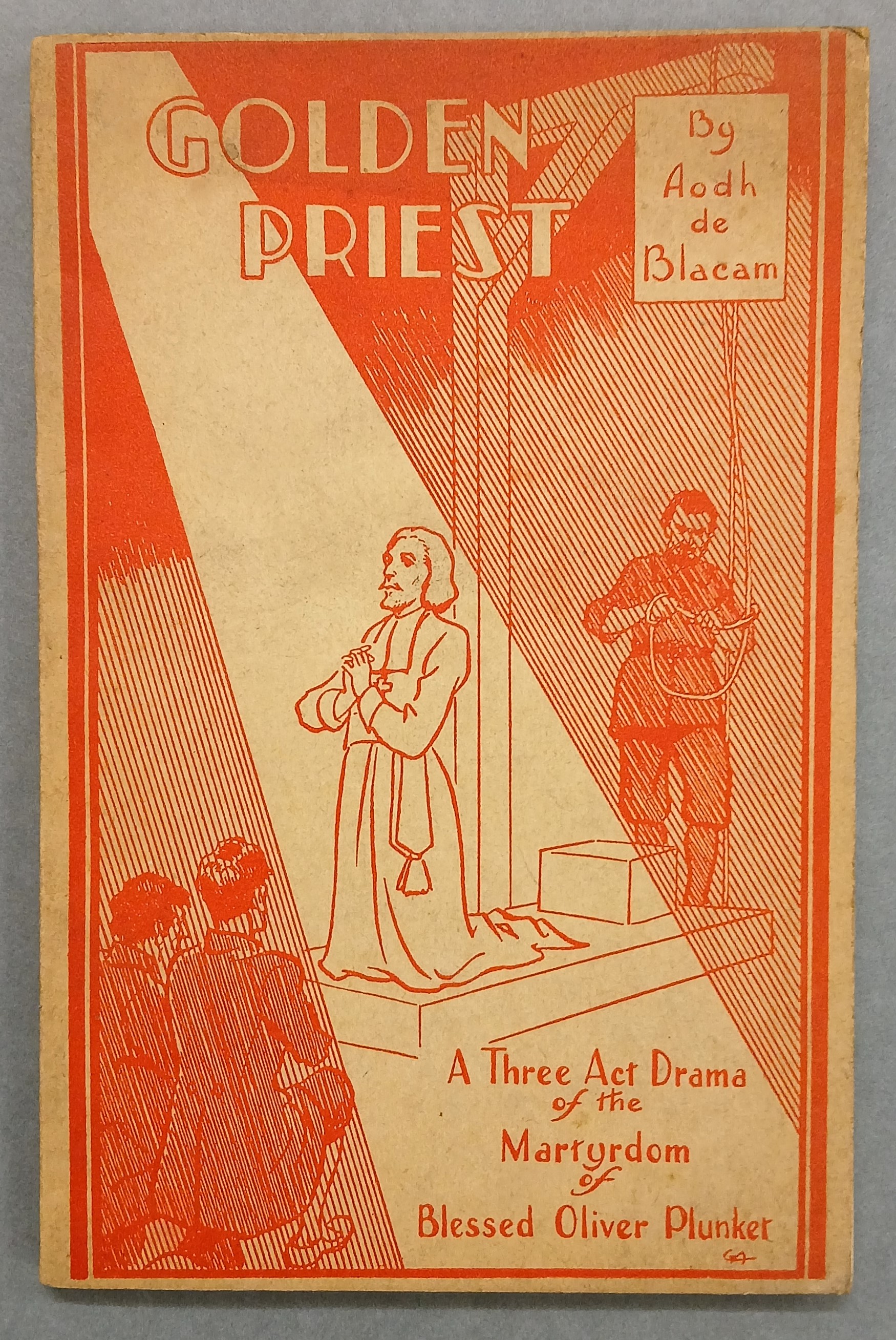 A copy of Aodh de Blacam, ‘Golden priest / a three act drama on the martyrdom of blessed Oliver Plunket’ (Dublin: M.H. Gill and Son, Ltd., 1943).