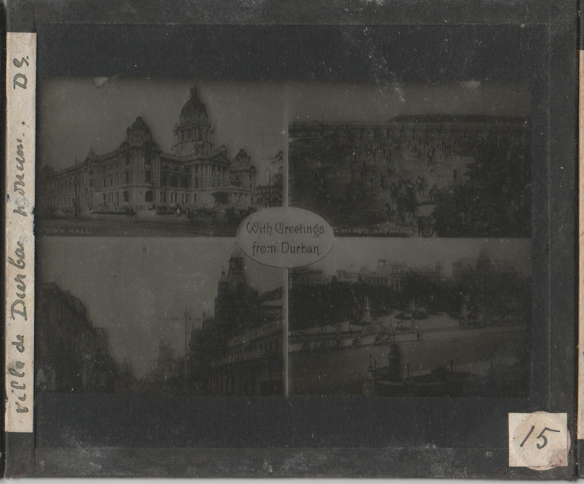 Postcard with "Greetings from Durban" written in middle. 4 images. One in each corner.