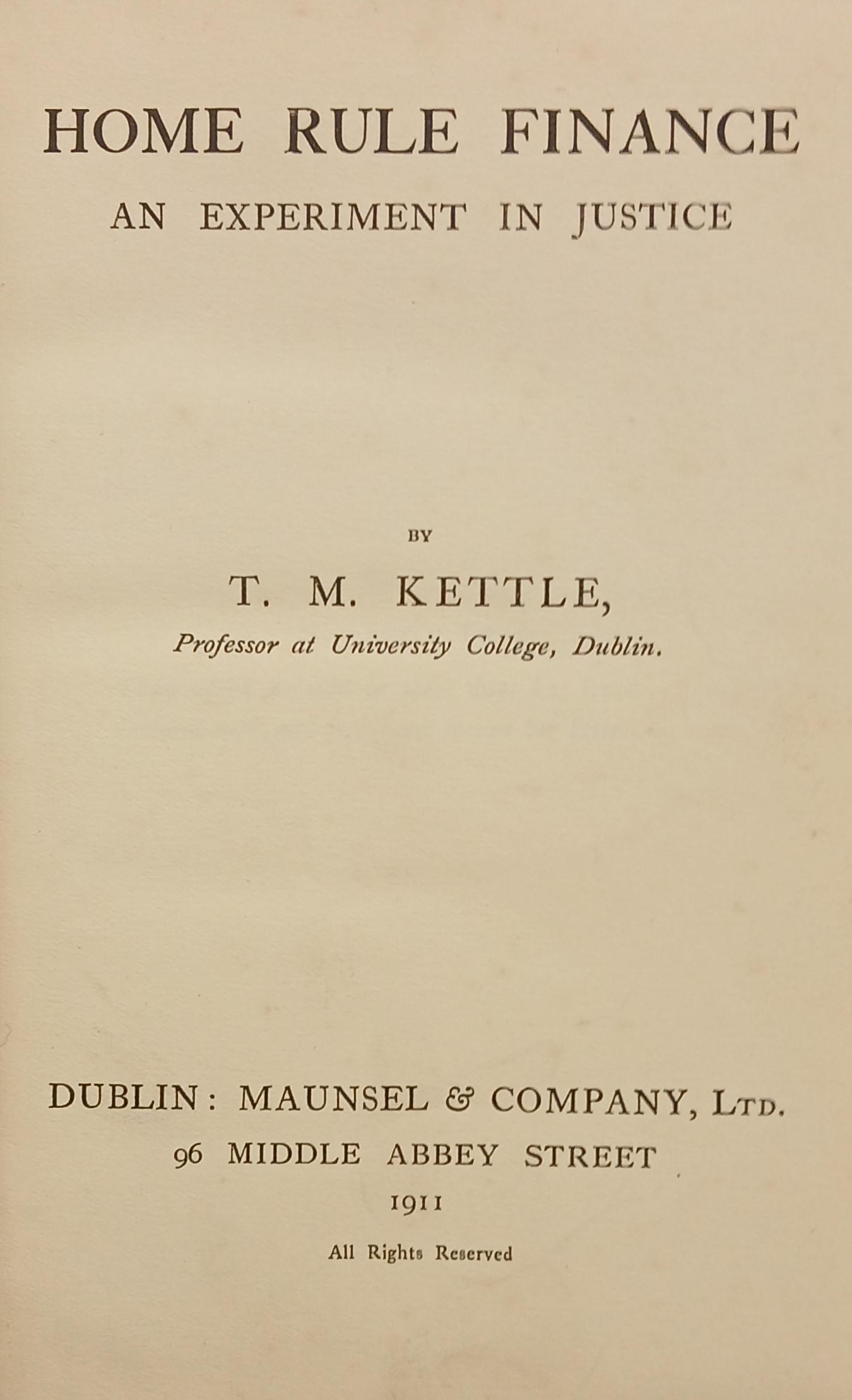 A copy of T.M. Kettle, ‘Home rule finance / an experiment in justice’ (Dublin: Maunsel & Co., 1911). BOUND WITH: George W. Russell (Æ), ‘Co-operation and nationality / a guide for rural reformers from this to the next generation’ (Dublin: Maunsel & Co., 1912).