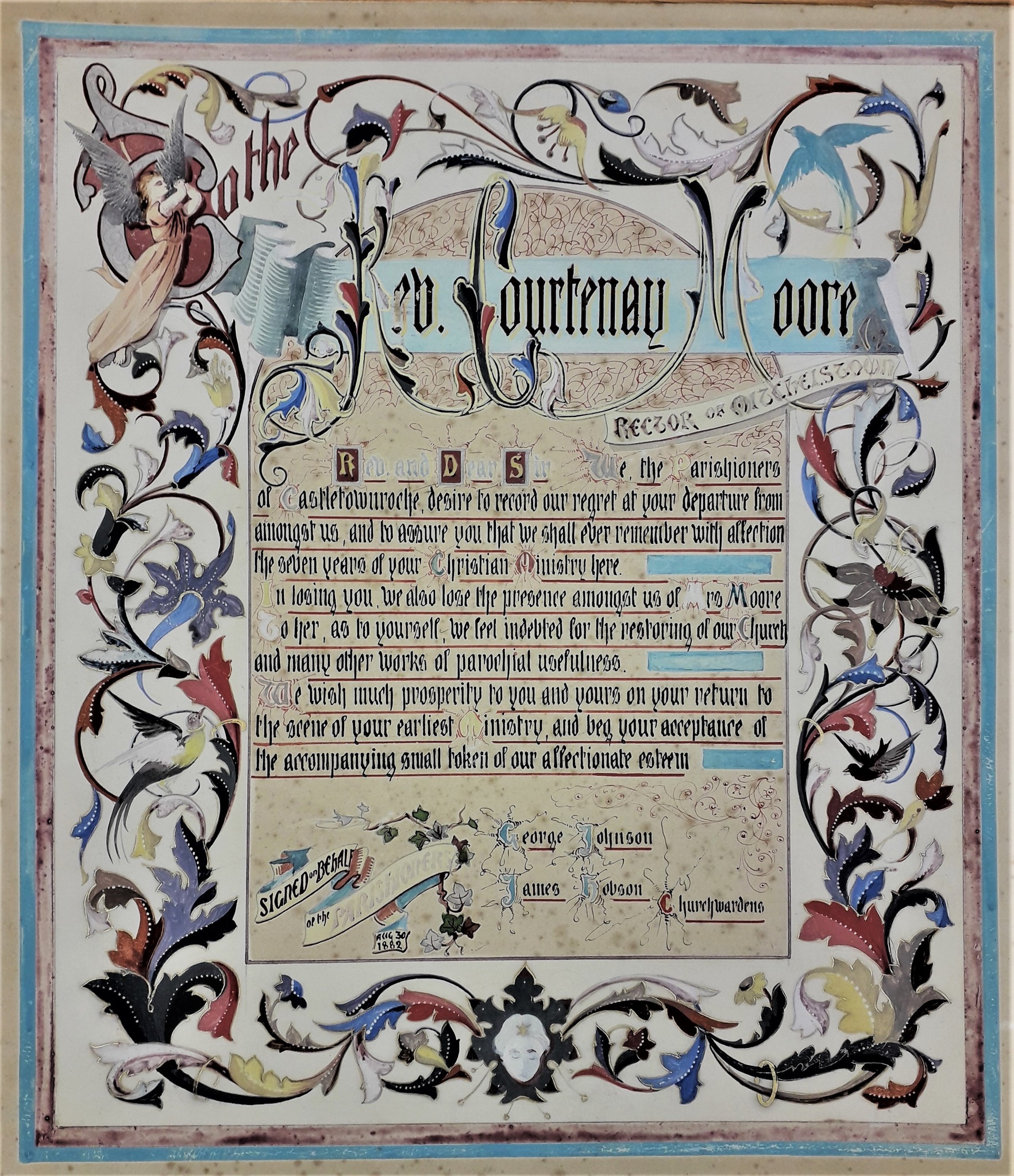 An illuminated farewell address to the Reverend Courtenay Moore (1842-1922) from the parishioners of Saint Mary’s Church of Ireland in Castletownroche, County Cork. The address is dated 30 August 1882 and refers to Reverend Moore’s work in restoring the church during his seven years of ministry in the parish.