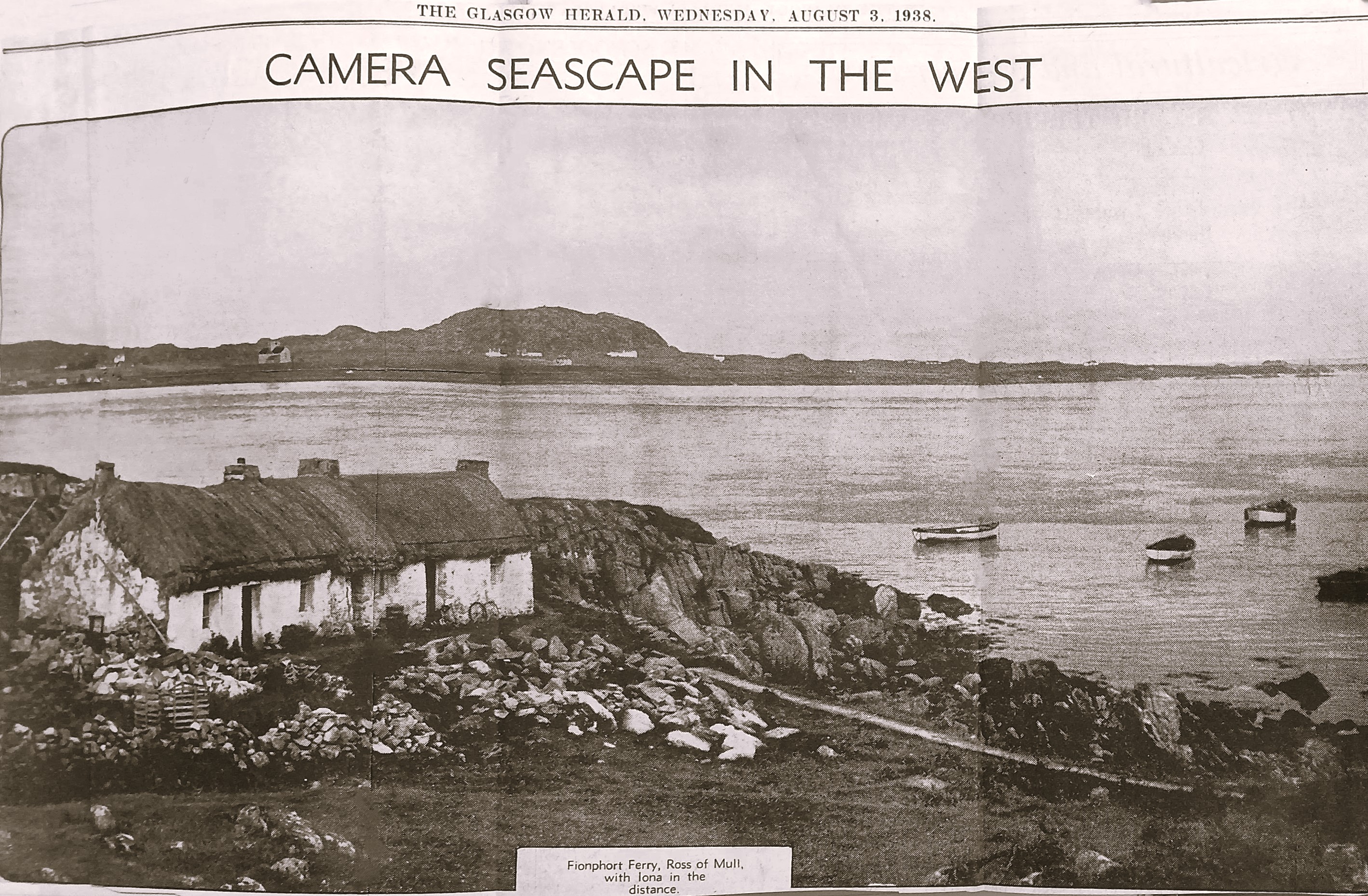 A clipping of a photograph titled ‘Fionphort Ferry, Ross of Mull / with Iona in the distance’. The monastic community on Iona was founded by Columba (521-597 AD), also known as Colmcille, an Irish abbot and missionary, in 563 AD. The clipping is taken from ‘The Glasgow Herald’ (3 August 1938).