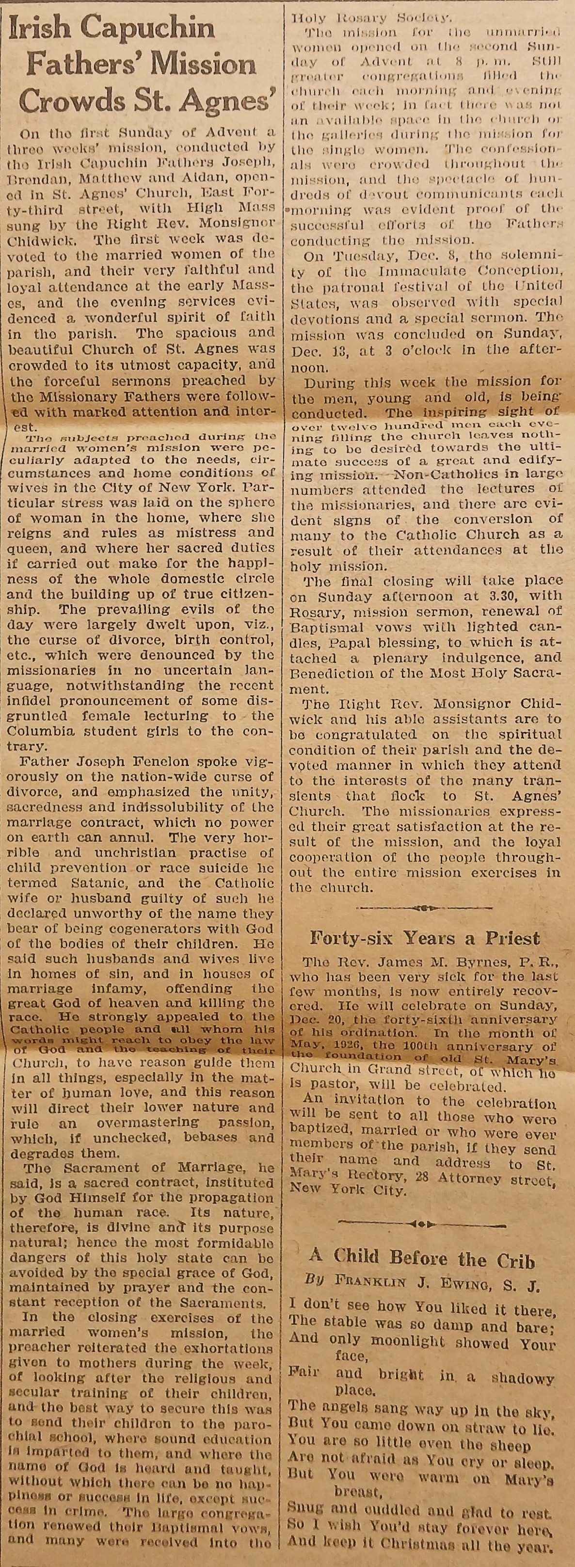 A clipping of an article reporting on a three-week mission at St. Agnes’ Church (East Forty-third Street, New York City) led by four Irish Capuchin friars: Fathers Joseph, Brendan, Matthew, and Aidan. The article notes a significant number of non-Catholics in attendance, some of whom reportedly converted. The clipping is taken from ‘The Catholic News’ (19 December 1925).
