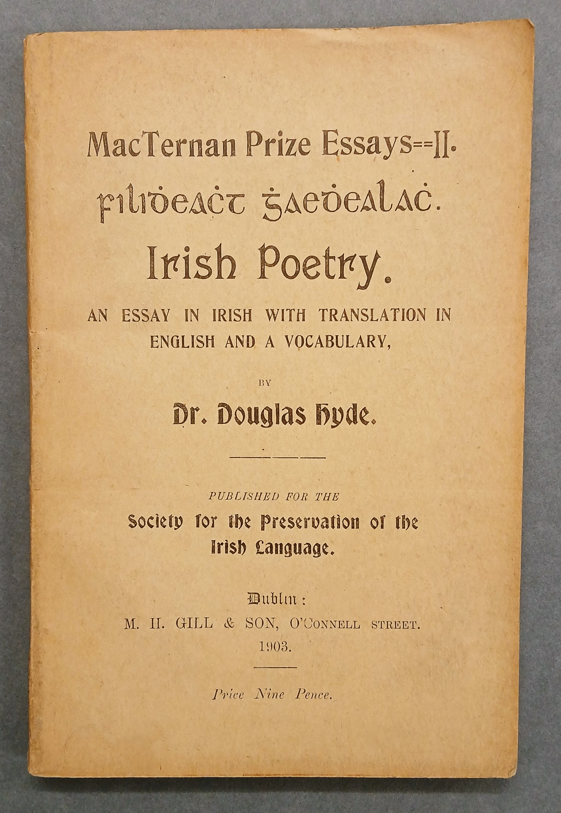 A copy of ‘Irish poetry / an essay in Irish with translation in English and a vocabulary by Douglas Hyde’ (Dublin: Published for the Society for the Preservation of the Irish Language [by] M.H. Gill, 1902).