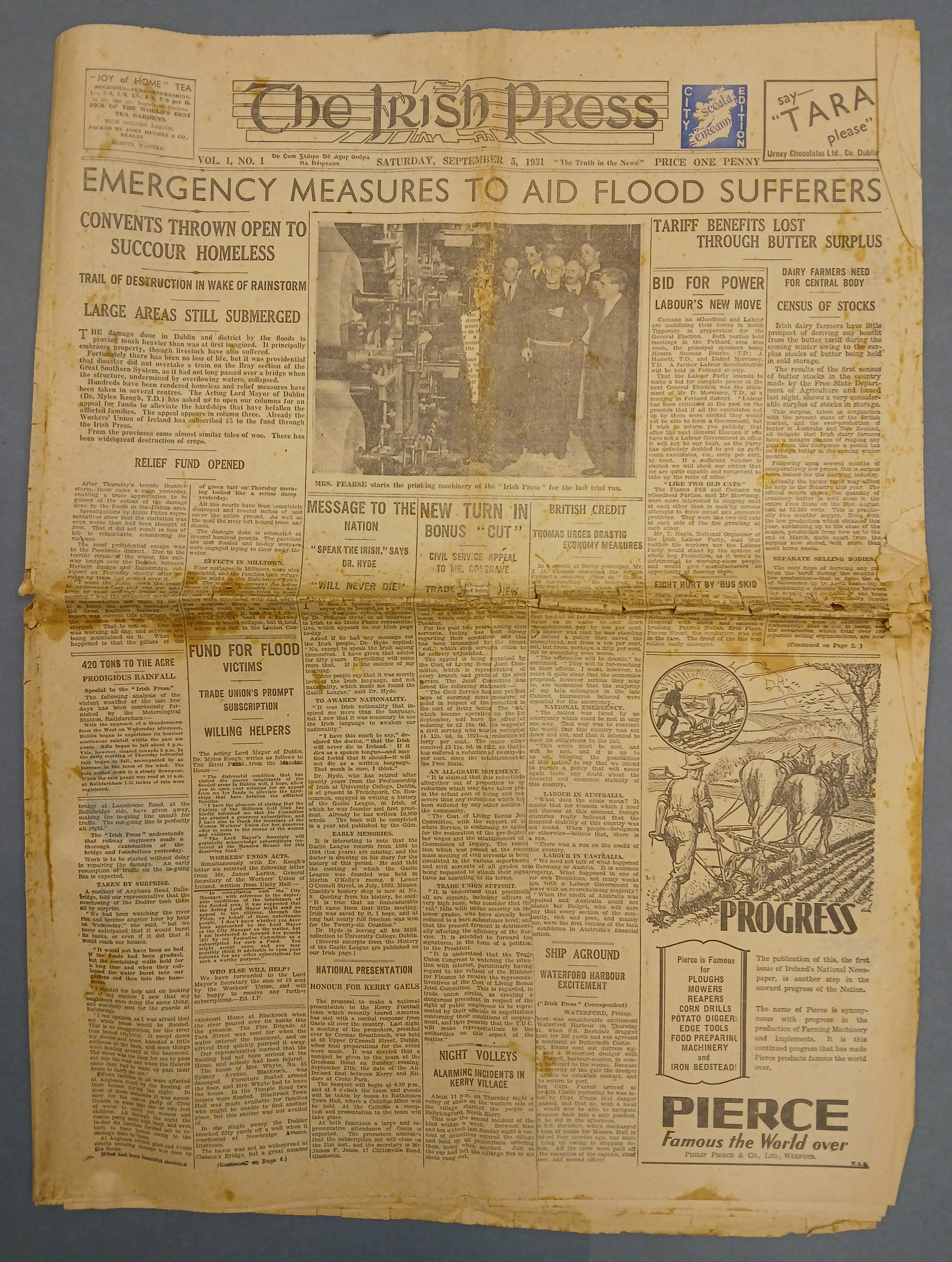 A copy of the ‘Irish Press’, Vol. 1, No. 1 (5 September 1931). This was the first edition of the newspaper.