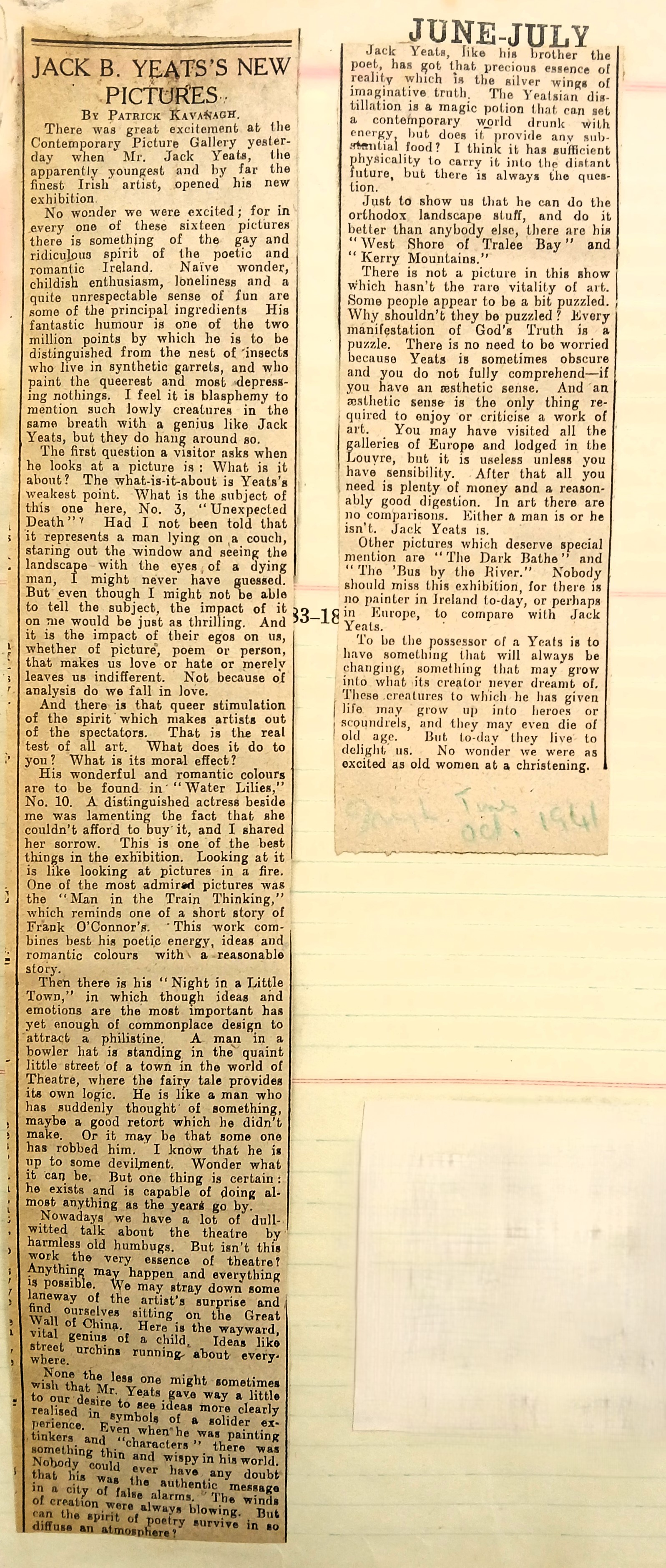 A clipping of a review article by Patrick Kavanagh of new work by Jack B. Yeats. The clipping is taken from the ‘Irish Times’ (October 1941).