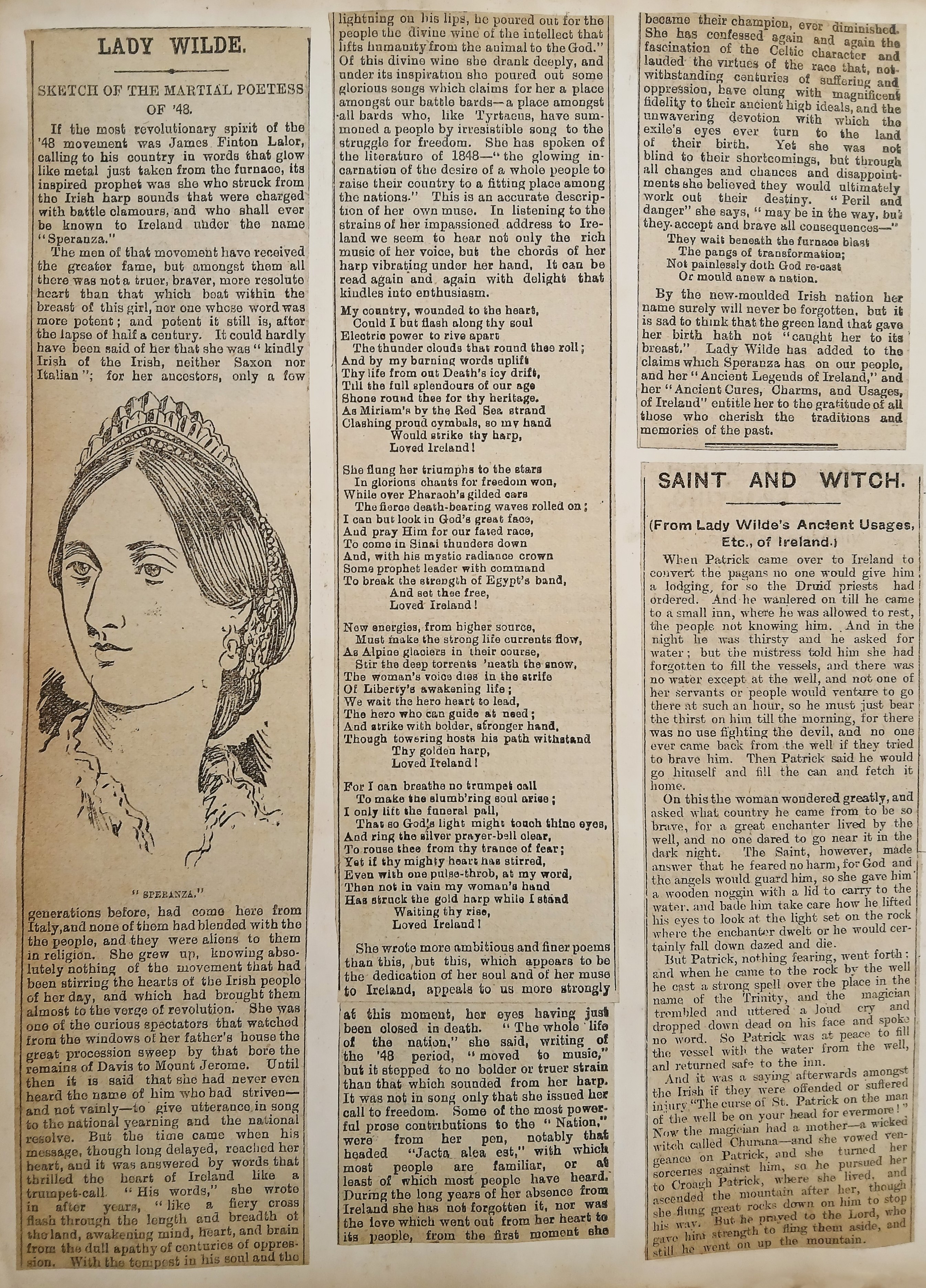 Clippings of articles reflecting on the life and work of the Irish poet and nationalist Jane Wilde (Lady Wilde), who wrote under the pen name ‘Speranza’.