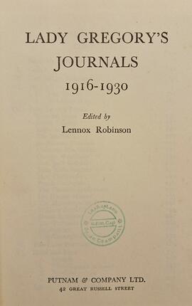 A copy of ‘Lady Gregory’s Journals, 1916-1930 / edited by Lennox Robinson’ (London: Putnam & Company ltd. / Printed by Browne and Nolan Ltd., [1946]). Several newspaper clippings including reviews of the publication and articles referring to Hugh Lane are inserted into the volume.