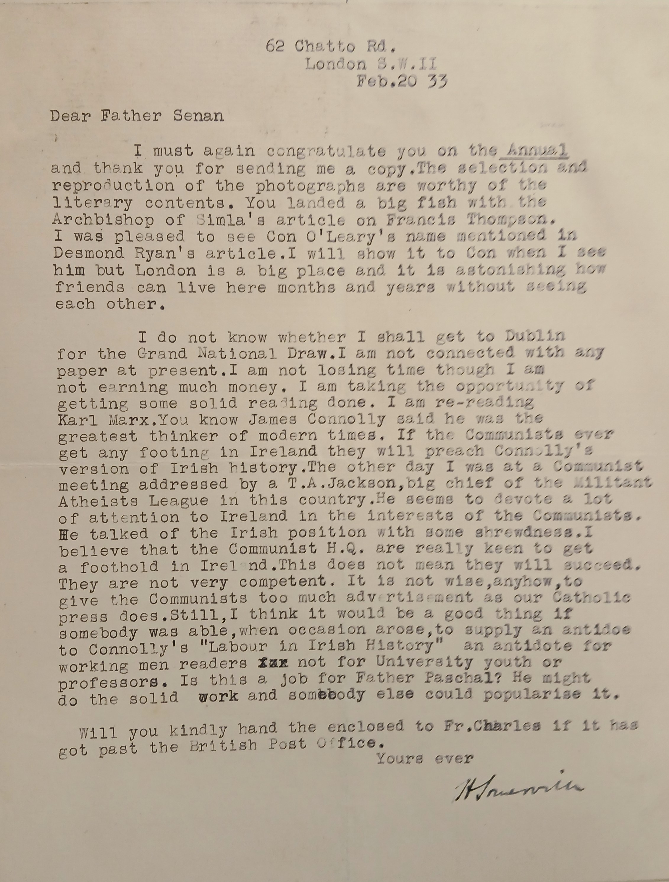 A letter from Edith Anna Œnone Somerville (H. Somerville) to Fr. Senan Moynihan OFM Cap. conveying her congratulations on the latest edition of ‘The Capuchin Annual’. She also refers to communist activities in both Britain and Ireland.