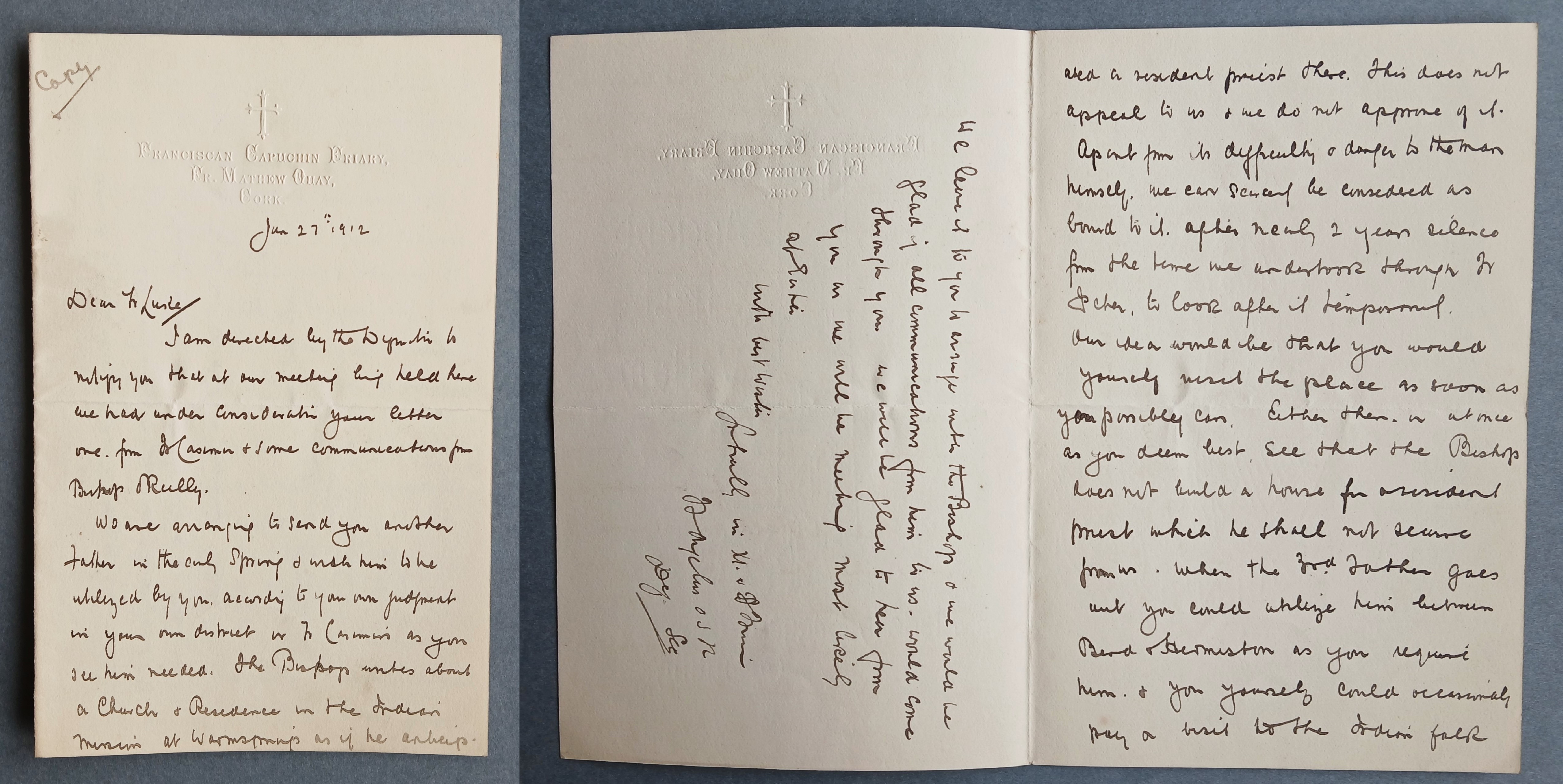 Copy letter from Fr. Angelus Healy OFM Cap. to Fr. Luke Sheehan OFM Cap. affirming that another priest will be sent to Oregon in early Spring to join him and Fr. Casimir. The letter refers to Bishop Charles Joseph O’Reilly’s desire to have a resident priest in the ‘Indian mission at Warm Springs’ which the Capuchins would not find desirable.